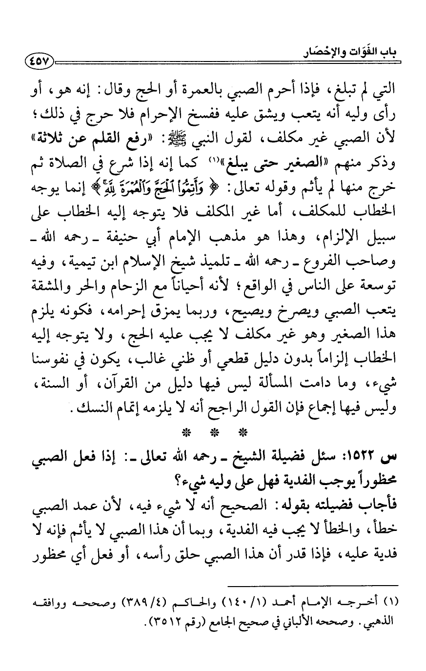 وصاحب الفروع- رحمه الله- تلميذ شيخ الإسلام ابن تيمية، وفيه توسعة على الناس في الواقع؛ لأنه أحياناً مع الزحام والحر والمشقة يتعب الصبي ويصرخ ويصيح، وربما يمزق إحرامه، فكونه يلزم
