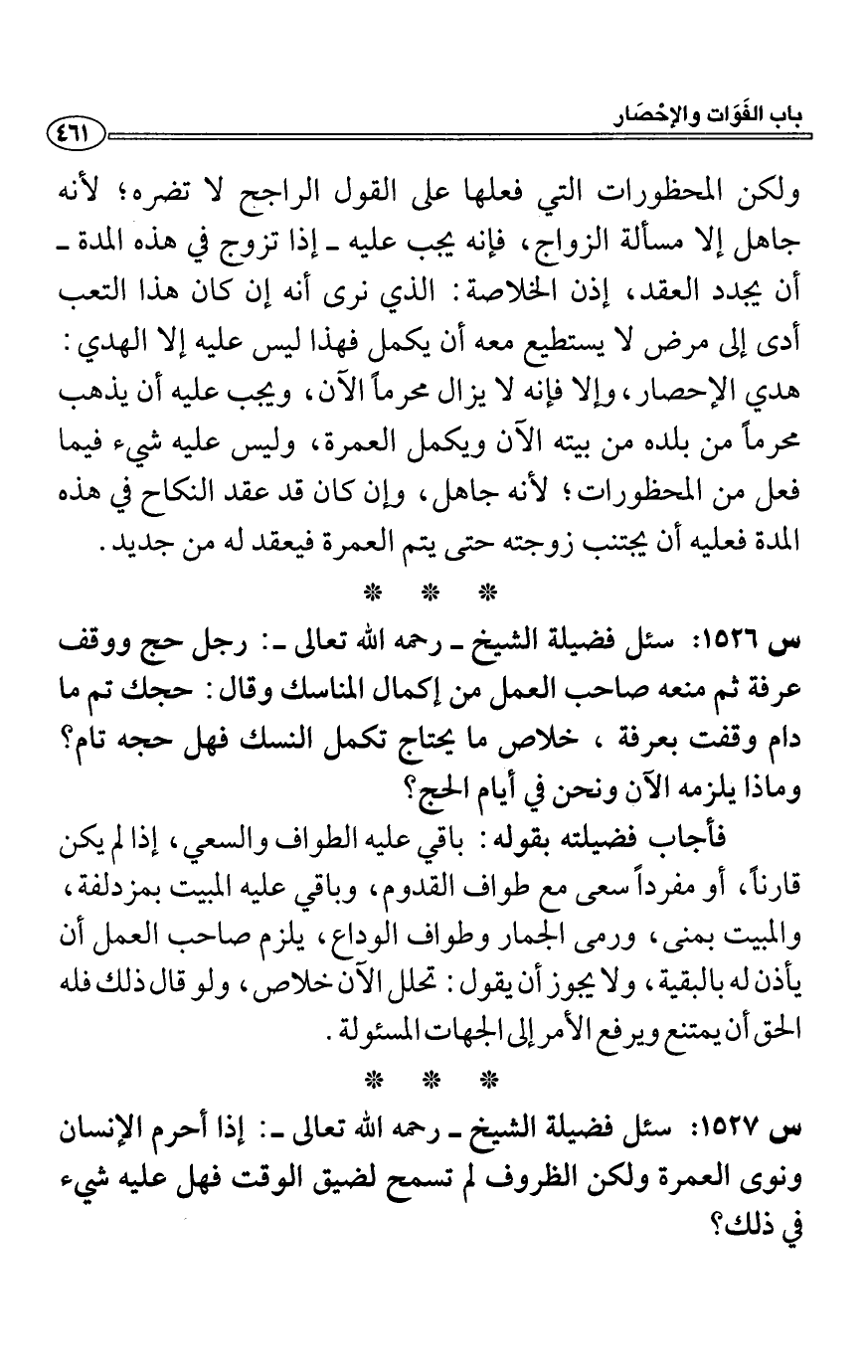 س 1527: سئل فضيلة الشيخ- رحمه الله تعالى-: إذا أحرم الإنسان ونوى العمرة ولكن الظروف لم تسمح لضيق الوقت فهل عليه شيء في ذلك؟