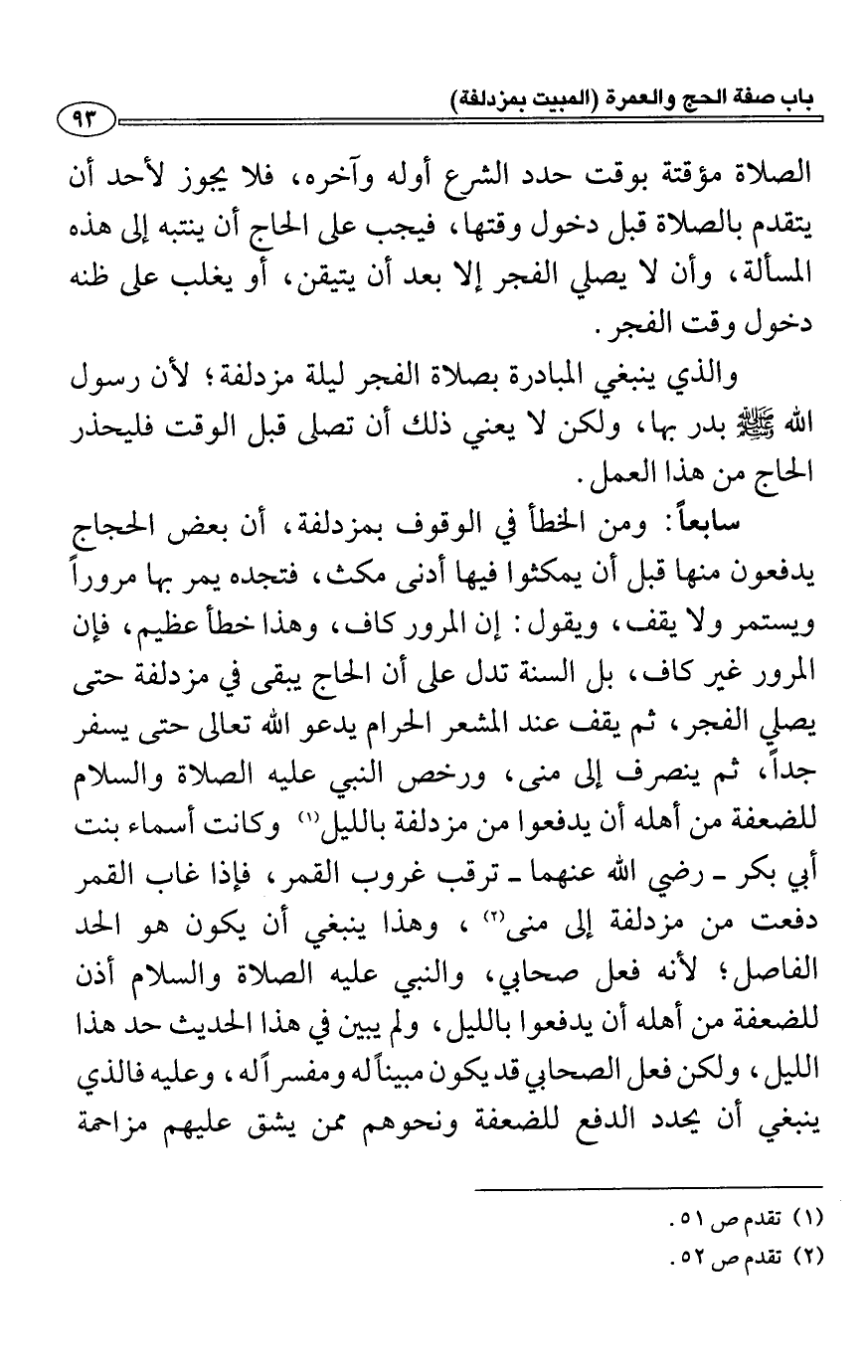 المرور غير كاف، بل السنة تدل على أن الحاج يبقى في مزدلفة حتى يصلي الفجر، ثم يقف عند المشعر الحرام يدعو الله تعالما حتى يسفر جداً، ثم ينصرف إلى منى، ورخص النبي عليه الصلاة والسلام للضعفة من أهله أن يدفعوا من مزدلفة بالليل (1) وكانت أسماء بنت أبي بكر- رضي الله عنهما- ترقب غروب المّمر، فإذا غاب القمر دفعت من مزدلفة إلى منى (2) ، وهذا ينبغي أن يكون هو الحد الفاصل؛ لأنه فعل صحابي، والنبي عليه الصلاة والسلام أذن للضعفة من أهله أن يدفعوا بالليل، ولم يبين في هذا الحديث حد هذا الليل، ولكن فعل الصحابي قد يكون مبيناً له ومفسر اً له، وعليه فالذي ينبغي أن يحدد الدفع للضعفة ونحوهم ممن يشق عليهم مزاحمة
