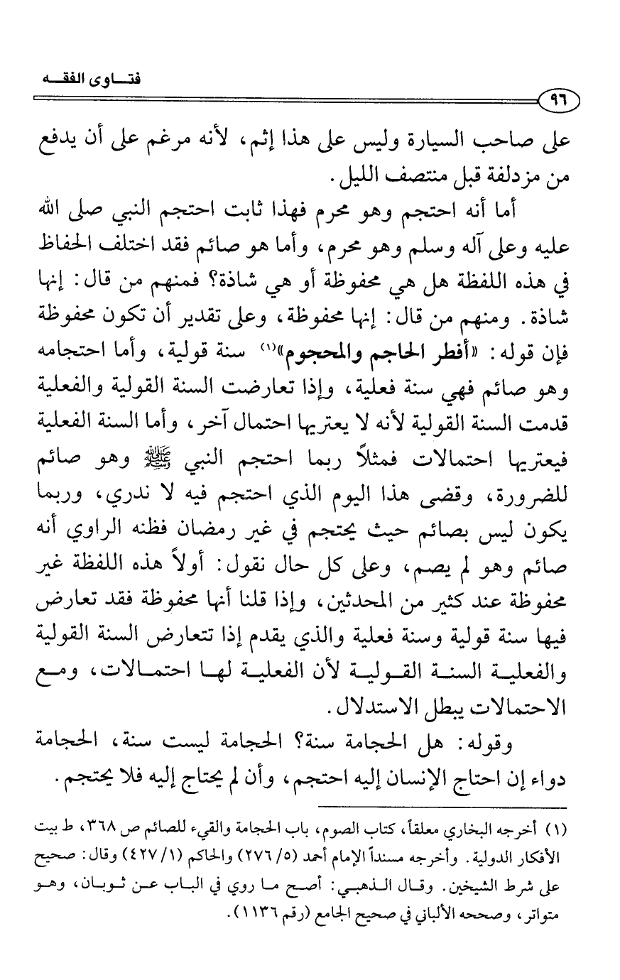 شاذة. ومنهم من قال: إنها محفوظة، وعلى تقدير أن تكون محفوظة فإن قوله: "أفطر الحاجم والمحجوم" (1) سنة قولية، وأما احتجامه وهو صائم فهي سنة فعلية، وإذا تعارضت السنة القولية والفعلية قدمت السنة القولية لأنه لا يعتريها احتمال آخر، وأما السنة الفعلية فيعتريها احتمالات فمثلاً ربما احتجم النبي - صلى الله عليه وسلم - وهو صائم للضرورة، وقضى هذا اليوم الذي احتجم فيه لا ندري، وربما يكون ليس بصائم حيث يحتجم في غير رمضان فظنه الراوي أنه صائم وهو لم يصم، وعلى كل حال نقول: أولاً هذه اللفظة غير محفوظة عند كثير من المحدثين، وإذا قلنا أنها محفوظة فقد تعارض فيها سنهْ قولية وسنة فعلية والذي يقدم إذا تتعارض السنة القولية والفعلية السنة القوليهْ لأن الفعلية لها احتمالات، ومع الاحتمالات يبطل الاستدلال.