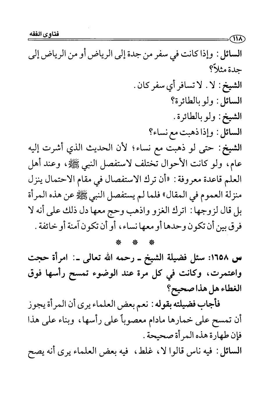 س 1658: سئل فضيلة الشيخ- رحمه الله تعالى-: امرأة حجت واعتمرت، وكانت في كل مرة عند الوضوء تمسح رأسها فوق الغطاء هل هذا صحيح؟