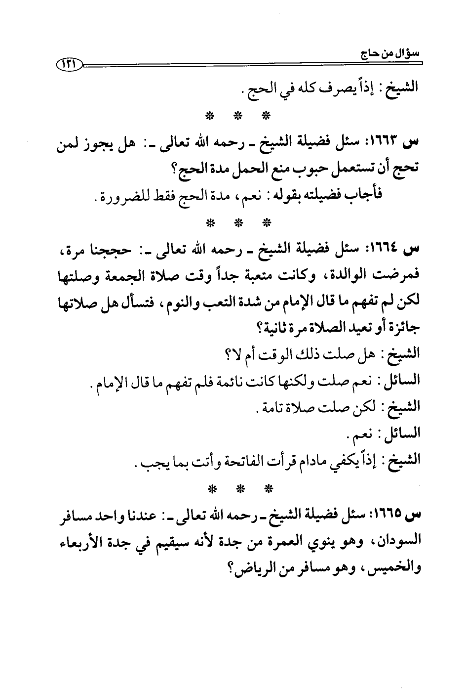 س 1663: سئل فضيلة الشيخ- رحمه الله تعالى-: هل يجوز لمن تحج أن تستعمل حبوب منع الحمل مدة الحج؟