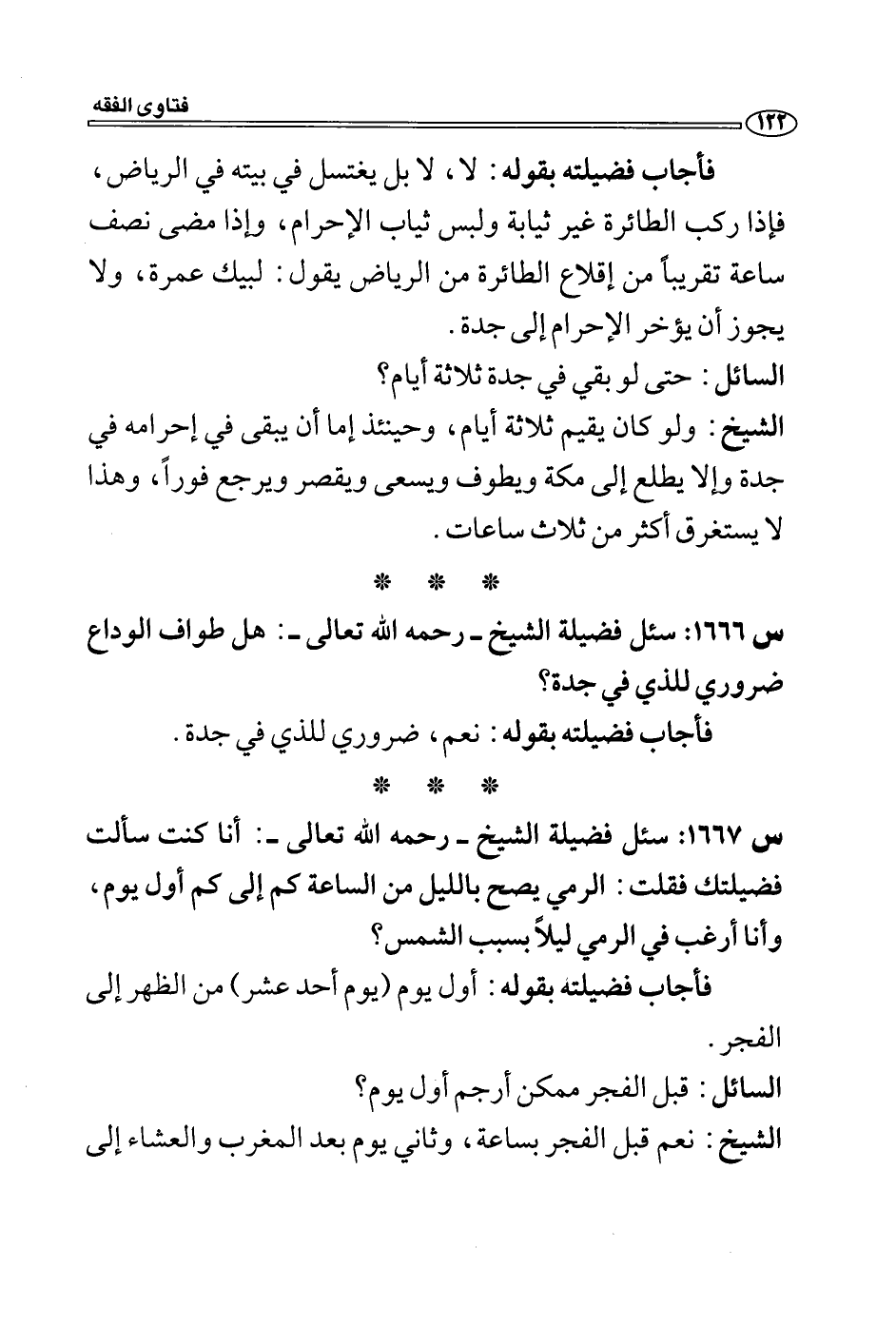 الشيخ: ولو كان يقيم ثلاثة أيام، وحينئذ إما أن يبقى في إحرامه في جدة وإلا يطلع إلى مكة ويطوف ويسعى ويقصر ويرجع فوراً، وهذا لا يستغرق أكثر من ثلاث ساعات.