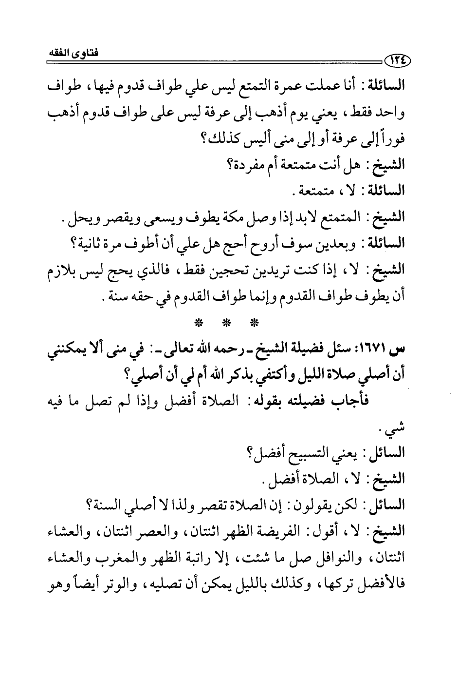س 1671: سئل فضيلة الشيخ- رحمه الله تعالى-: في منى ألا يمكنني أن أصلي صلاة الليل وأكتفي بذكر الله أم لي أن أصلي؟