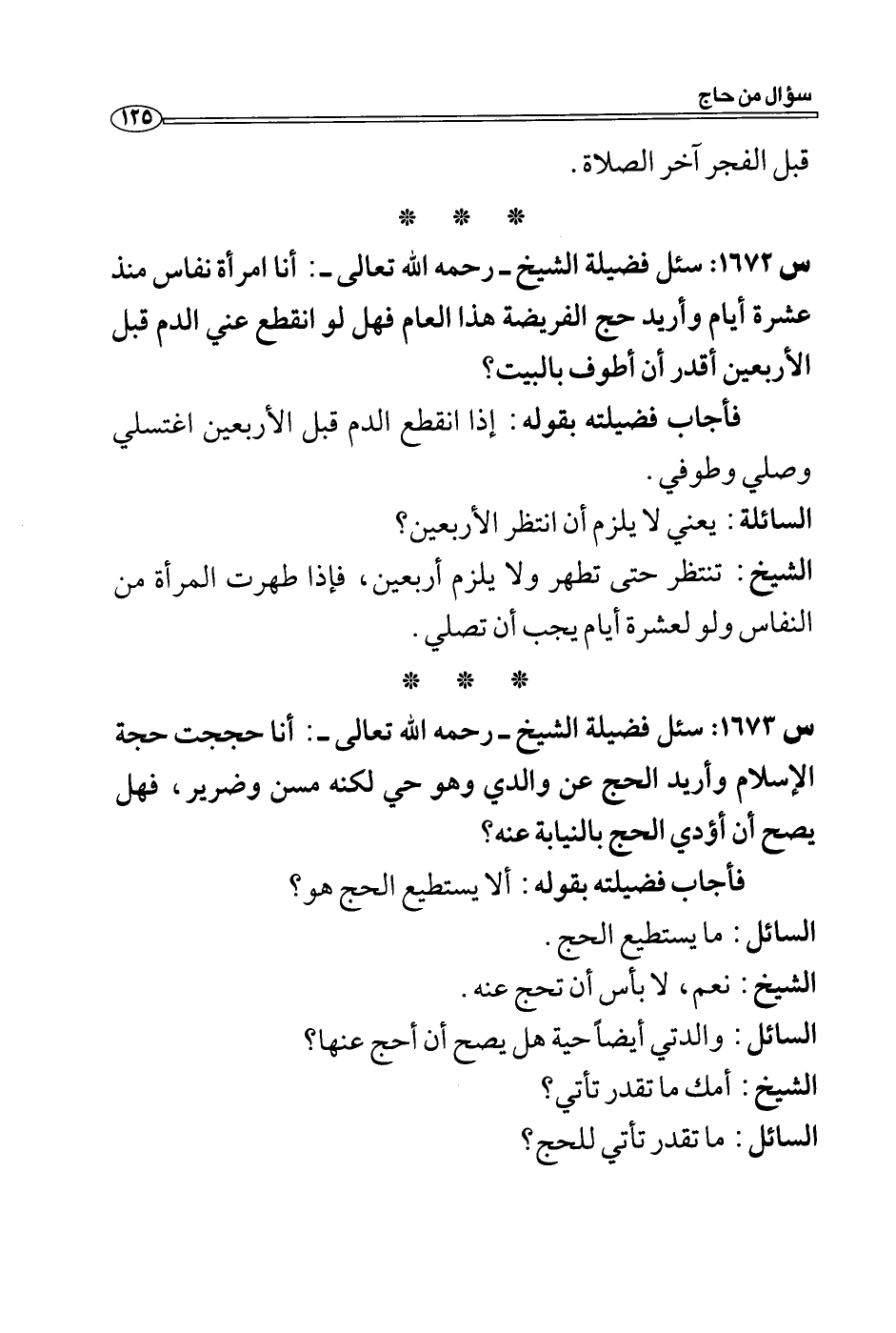 س 1672: سئل فضيلة الشيخ- رحمه الله تعالى-: أنا امرأة نفاس منذ عشرة أيام وأريد حج الفريضة هذا العام فهل لو انقطع عني الدم قبل الأربعين أقدر أن أطوف بالبيت؟