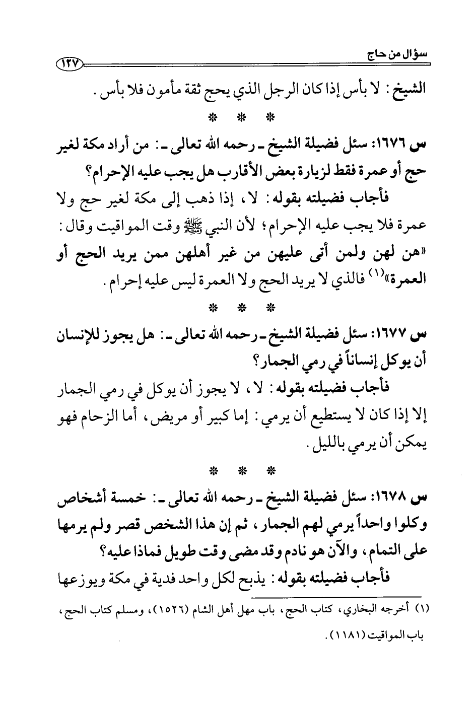 س 1677: سئل فضيلة الشيخ- رحمه الله تعالى-: هل يجوز للإنسان أن يوكل إنساناً في رمي الجمار؟