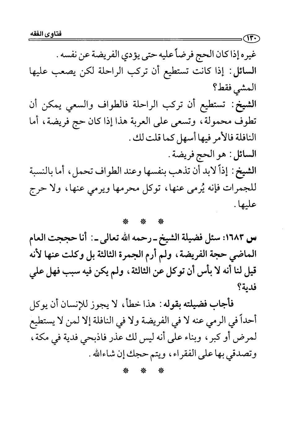 غيره إذا كان الحج فرضاً عليه حتى يؤدي الفريضة عن نفسه. السائل: إذا كانت تستطيع أن تركب الراحلة لكن يصعب عليها المشي فقط؟