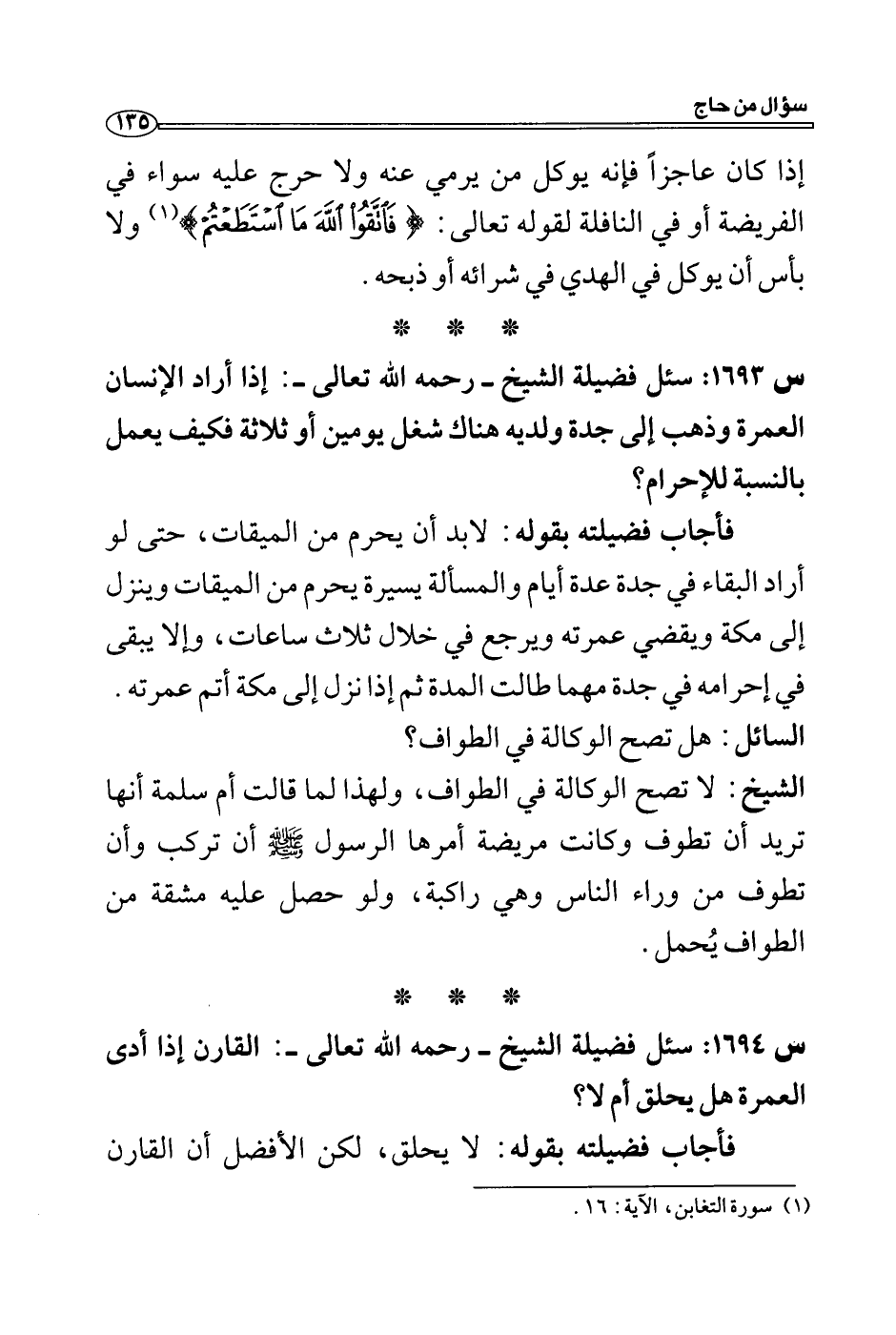 س 1694: سئل فضيلة الشيخ- رحمه الله تعالى-: القارن إذا أدى العمرة هل يحلق أم لا؟