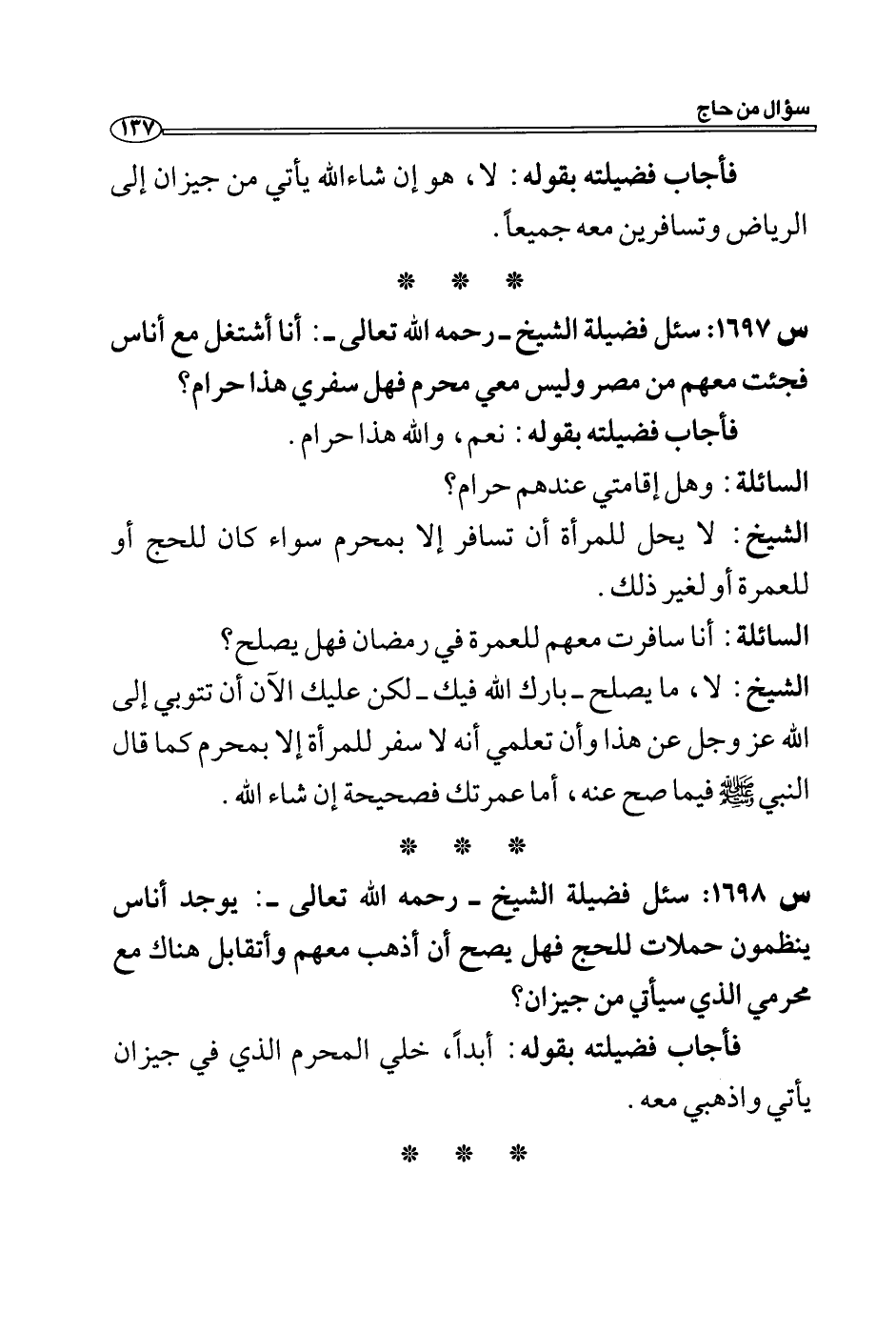 س 1698: سئل فضيلة الشيخ- رحمه الله تعالى-: يوجد أناس ينظمون حملات للحج فهل يصح أن أذهب معهم وأتقابل هناك مع محرمي الذي سيأتي من جيزان؟