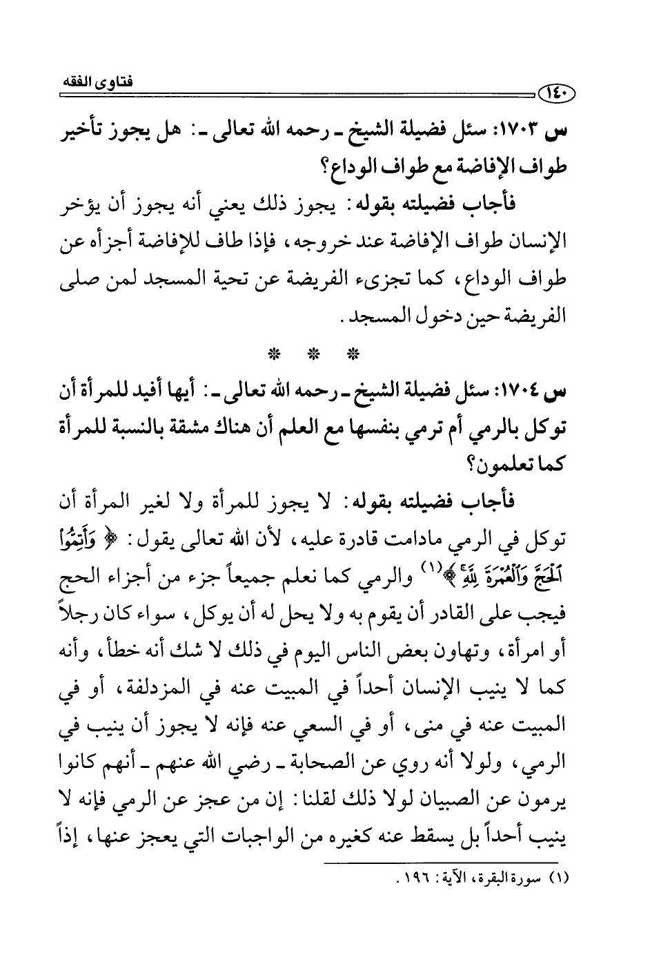 س 1704: سئل فضيلة الشيخ- رحمه الله تعالى-: أيها أفيد للمرأة أن توكل بالرمي أم ترمي بنفسها مع العلم أن هناك مشقة بالنسبة للمرأة كما تعلمون؟