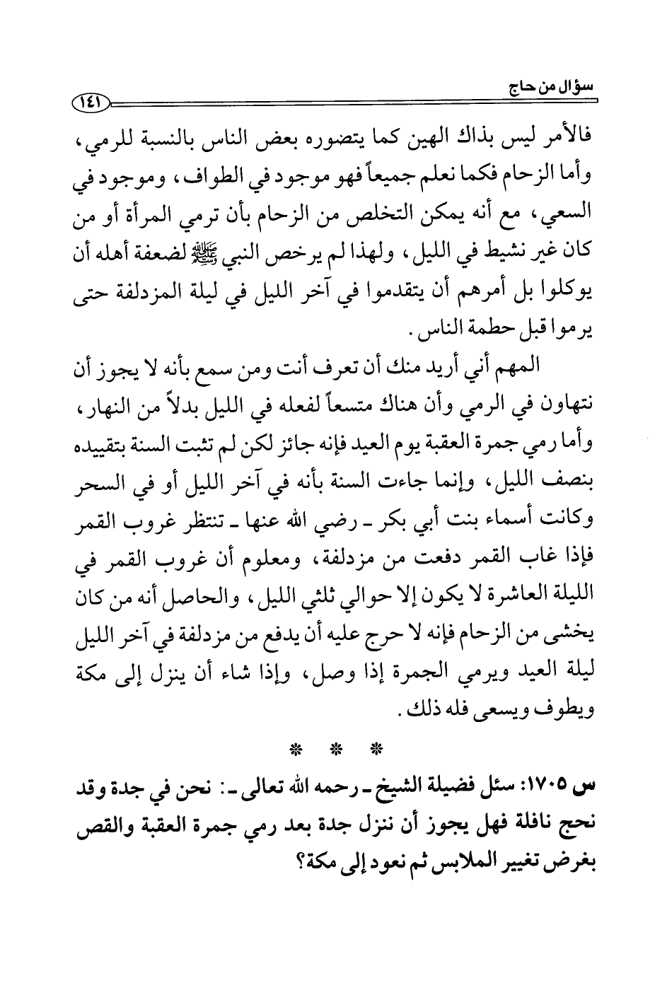 س 1705: سئل فضيلة الشيخ- رحمه الله تعالى-: نحن في جدة وقد نحج نافلة فهل يجوز أن ننزل جدة بعد رمي جمرة العقبة والقص بغرض تغيير الملابس ثم نعود إلى مكة؟