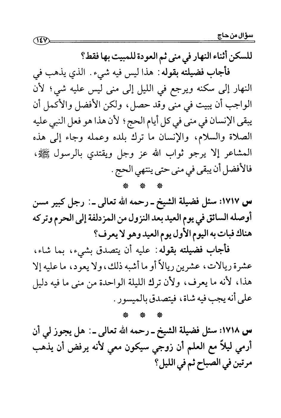 س 1718: سئل فضيلة الشيخ- رحمه الله تعالى-: هل يجوز لي أن أرمي ليلاً مع العلم أن زوجي سيكون معي لأنه يرفض أن يذهب مرتين في الصباح ثم في الليل؟