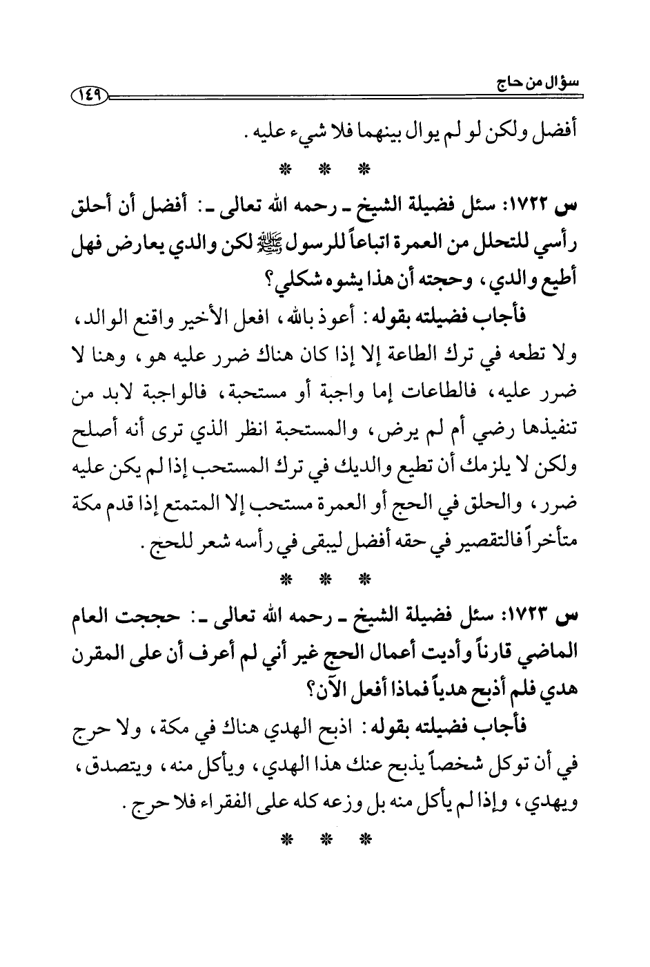 س 1722: سئل فضيلة الشيخ- رحمه الله تعالى-: أفضل أن أحلق رأسي للتحلل من العمرة اتباعاً للرسول - صلى الله عليه وسلم - لكن والدي يعارض فهل أطيع والدي، وحجته أن هذا يشوه شكلي؟