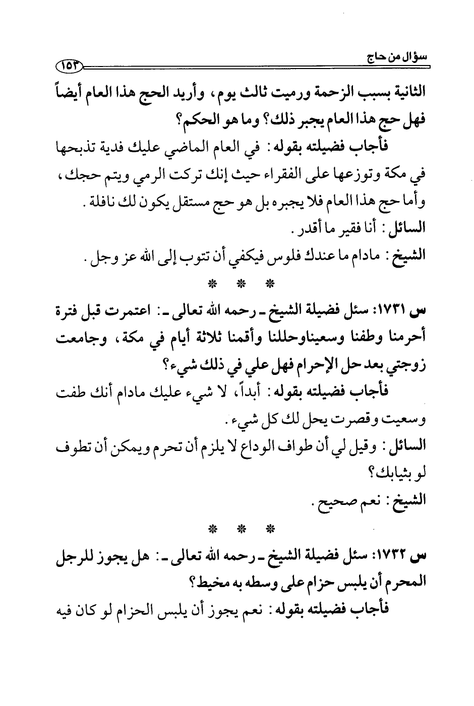 س 1732: سئل فضيلة الشيخ- رحمه الله تعالى-: هل يجوز للرجل المحرم أن يلبس حزام على وسطه به مخيط؟