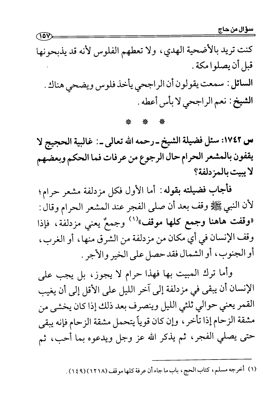 فأجاب فضيلته بقوله: أما الأول فكل مزدلفة مشعر حرام؛ لأن النبي - صلى الله عليه وسلم - وقف بعد أن صلى الفجر عند المشعر الحرام وقال: "وقفت هاهنا وجمع كلها موقف " (1) وجمع يعني مزدلفة، فإذا وقف الإنسان في أي مكان من مزدلفة من الشرق منها، أو الغرب، أو الجنوب، أو الشمال فقد حصل على الخير والأجر.
