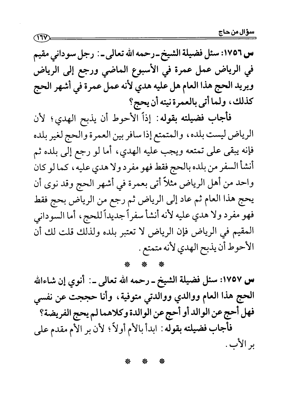فأجاب فضيلته بقوله: إذاً الأحوط أن يذبح الهدي؛ لأن الرياض ليست بلده، والمتمتع إذا سافر بين العمرة والحج لغير بلده فإنه يبقى على تمتعه ويجب عليه الهدي، أما لو رجع إلى بلده ثم أنشأ السفر من بلده بالحج فقط فهو مفرد ولا هدي عليه، كما لو كان واحد من أهل الرياض مثلاً أتى بعمرة في أشهر الحج وقد نوى أن يحج هذا العام ثم عاد إلى الرياض ثم رجع من الرياض بحج فقط