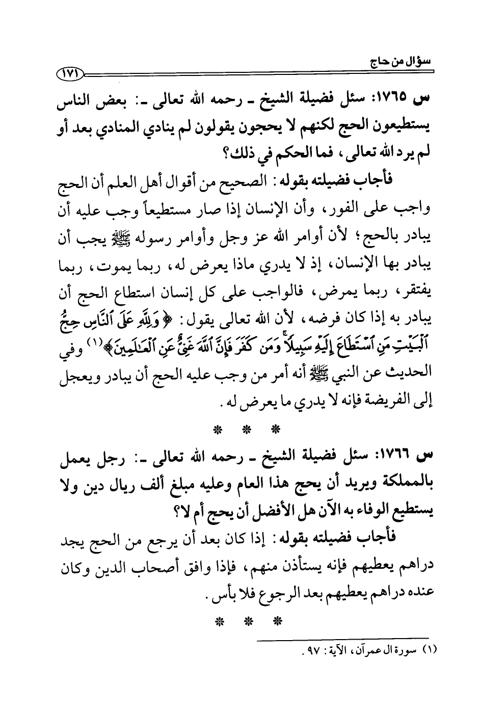 س 1766: سئل فضيلة الشيخ- رحمه الله تعالى-: رجل يعمل بالمملكة ويريد أن يحج هذا العام وعليه مبلغ ألف ريال دين ولا يستطيع الوفاء به الآن هل الأفضل أن يحج أم لا؟