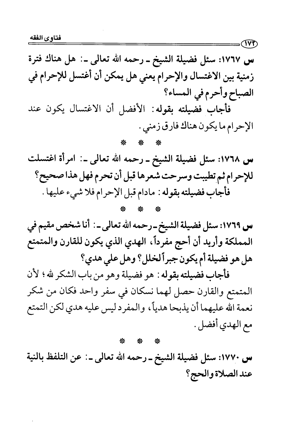 س 1767: سئل فضيلة الشيخ- رحمه الله تعالى-: هل هناك فترة زمنية بين الاغتسال والإحرام يعني هل يمكن أن أغتسل للإحرام في الصباح وأحرم في المساء؟