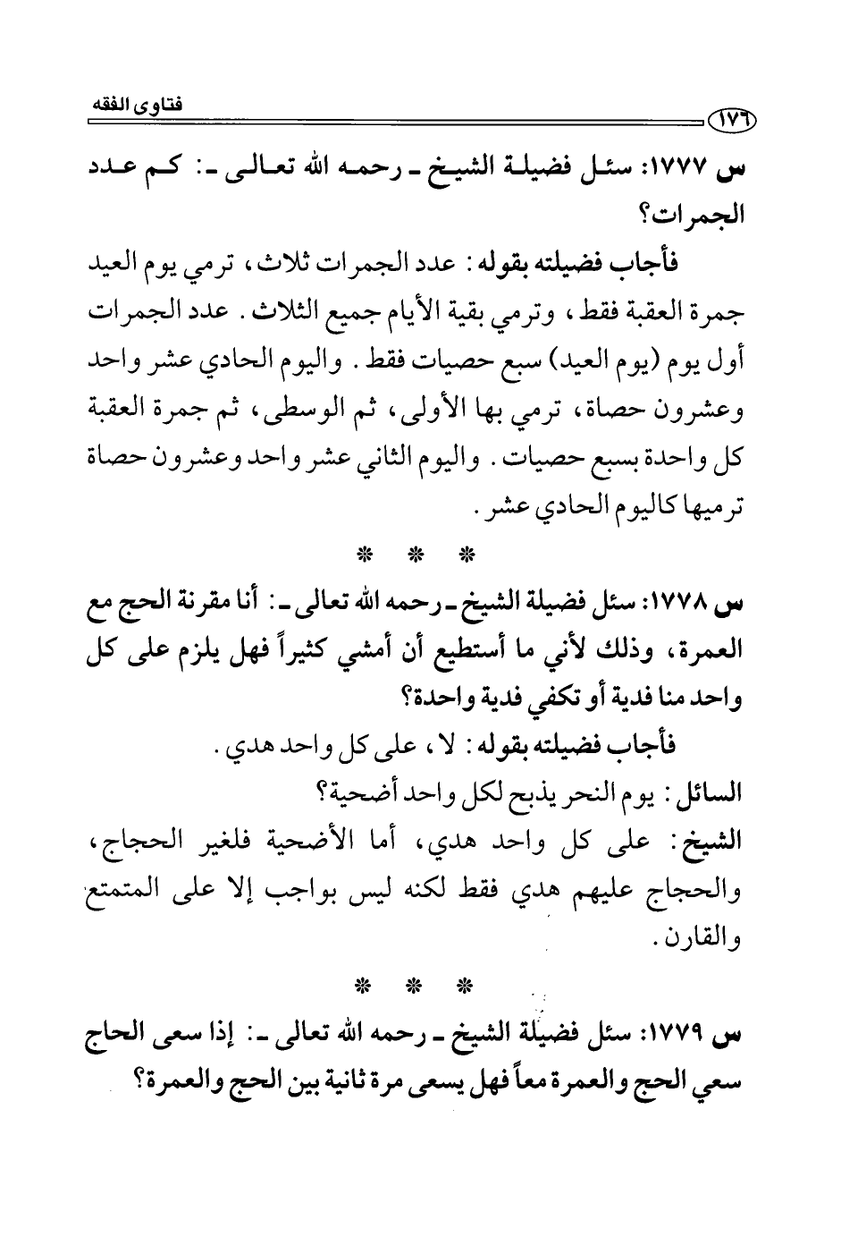 س 1777: سئل فضيلة الشيخ- رحمه الله تعالى-: كم عدد الجمرات؟