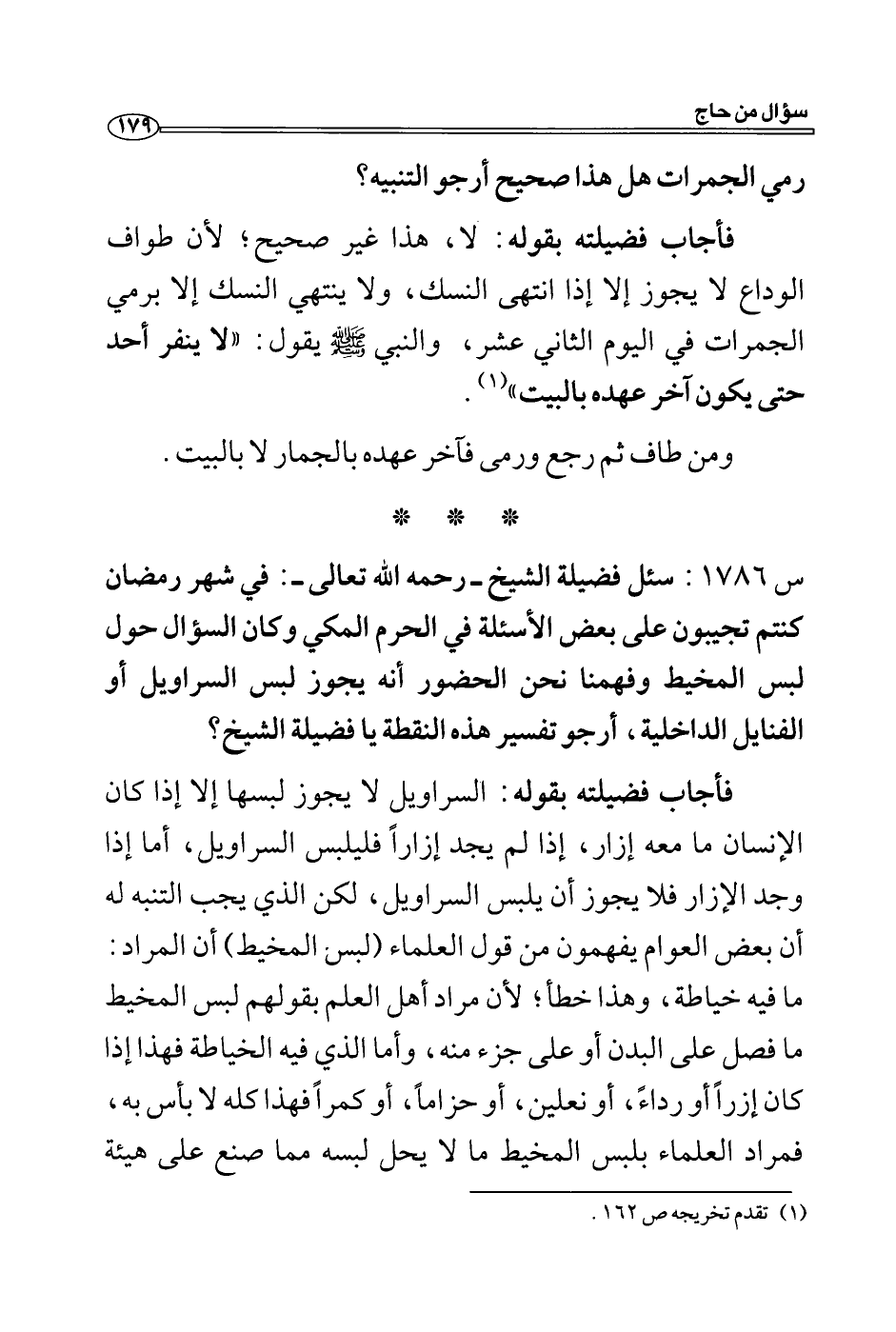 س 1786: سئل فضيلة الشيخ- رحمه الله تعالى-: في شهر رمضان كنتم تجيبون على بعض الأسئلة في الحرم المكي وكان السؤال حول لبس المخيط وفهمنا نحن الحضور أنه يجوز لبس السراويل أو
