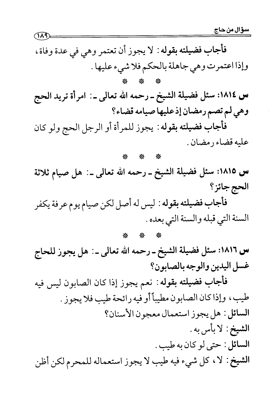س 1816: سئل فضيلة الشيخ- رحمه الله تعالى-: هل يجوز للحاج غسل اليدين والوجه بالصابون؟