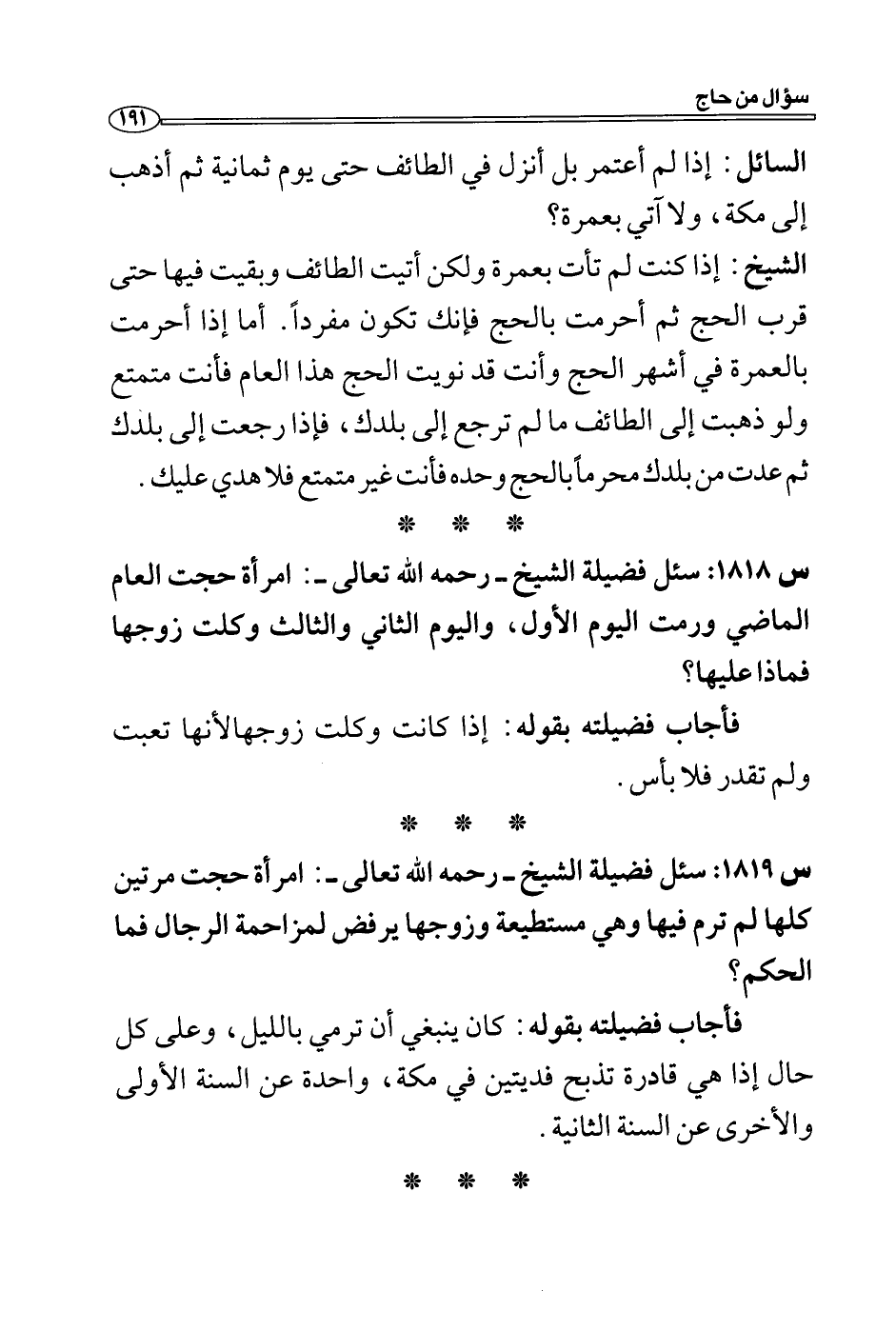 س 1819: سئل فضيلة الشيخ- رحمه الله تعالى-: امرأة حجت مرتين كلها لم ترم فيها وهي مستطيعة وزوجها يرفض لمزاحمة الرجال فما الحكم؟