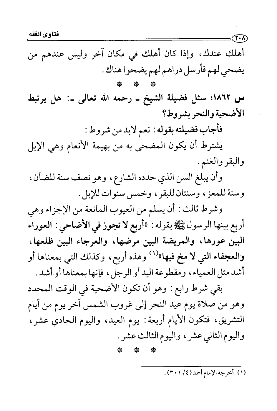وشرط ثالث: أن يسلم من العيوب المانعة من الإجزاء وهي أربع بينها الرسول - صلى الله عليه وسلم - بقوله: " أربع لا تجوز في الأضاحي: العوراء البين عورها، والمريضة البين مرضها، والعرجاء البين ظلعها، والعجفاء التي لا مخ فيها" (1) وهذه أربع، وكذلك التي بمعناها أو أشد مثل العمياء، ومقطوعة اليد أو الرجل، فإنها بمعناها أو أشد.