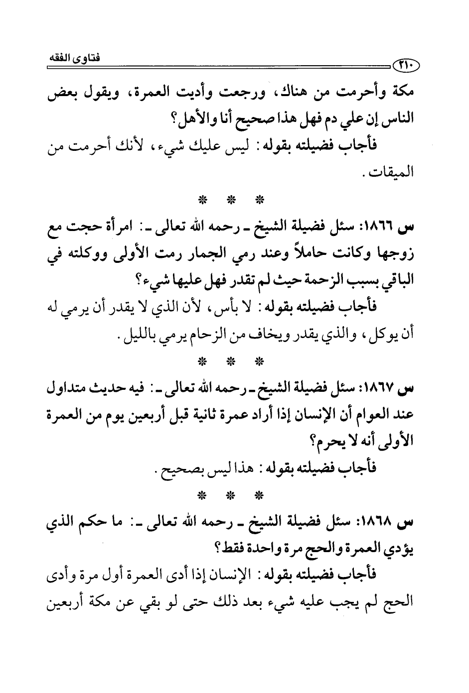 س 1867: سئل فضيلة الشيخ- رحمه الله تعالى-: فيه حديث متداول عند العوام أن الإنسان إذا أراد عمرة ثانية قبل أربعين يوم من العمرة الأولى أنه لا يحرم؟