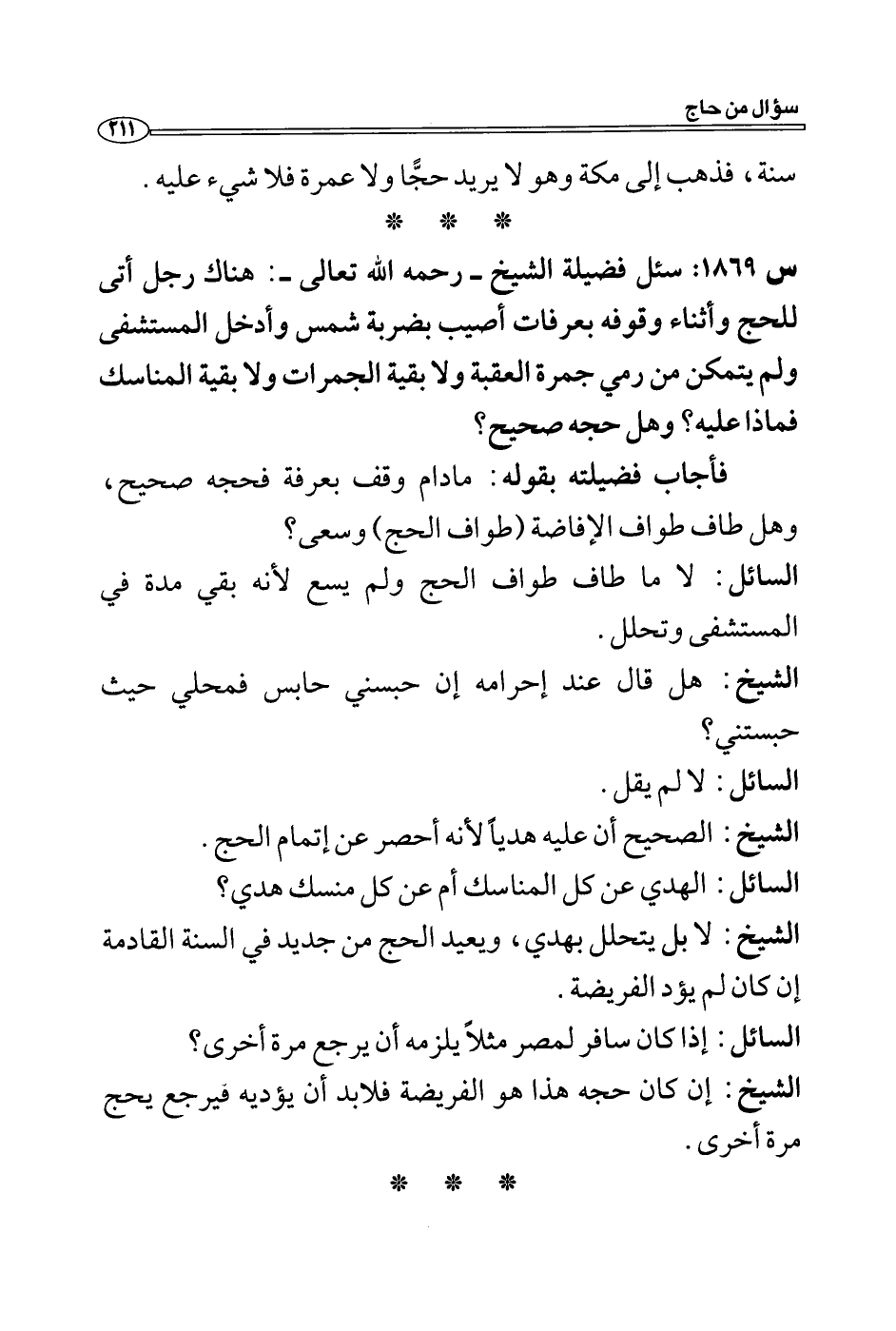 س 1869: سئل فضيلة الشيخ- رحمه الله تعالى-: هناك رجل أتى للحج وأثناء وقوفه بعرفات أصيب بضربة شمس وأدخل المستشفى ولم يتمكن من رمي جمرة العقبة ولا بقية الجمرات ولا بقية المناسك فماذا عليه؟ وهل حجه صحيح؟