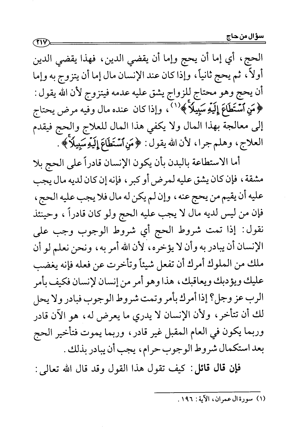 الحج، أي إما أن يحج وإما أن يقضي الدين، فهذا يقضي الدين أولاً، ثم يحج ثانياً، وإذا كان عند الإنسان مال إما أن يتزوج به وإما أن يحج وهو محتاج للزواج يشق عليه عدمه فيتزوج لأن الله يقول: (مَنِ اسْتَطَاعَ إِلَيْهِ سَبِيلًا) (1) ، وإذا كان عنده مال وفيه مرض يحتاج إلى معالجة بهذا المال ولا يكفي هذا المال للعلاج والحج فيقدم العلاج، وهلم جر ا، لأن الله يقول: (مَنِ اسْتَطَاعَ إِلَيْهِ سَبِيلًا) .
