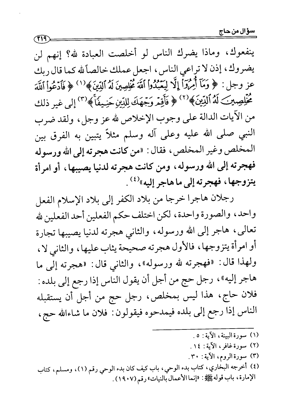 ينفعوك، وماذا يضرك الناس لو أخلصت العبادة لله؟ إنهم لن يضروك، إذن لا تر اعي الناس، اجعل عملك خالصاً لله كما قال ربك عز وجل: (وَمَا أُمِرُوا إِلَّا لِيَعْبُدُوا اللَّهَ مُخْلِصِينَ لَهُ الدِّينَ) (1) (فَادْعُوا اللَّهَ مُخْلِصِينَ لَهُ الدِّينَ) (2) (فَأَقِمْ وَجْهَكَ لِلدِّينِ حَنِيفًا) (3) إلى غير ذلك من الآيات الدالة على وجوب الإخلاص لله عز وجل، ولقد ضرب النبي صلى الله عليه وعلى آله وسلم مثلاً يتبين به الفرق بين المخلص وغير المخلص، فقال: "من كانت هجرته إلى الله ورسوله فهجرته إلى الله ورسوله، ومن كانت هجرته لدنيا يصيبها، أو امرأة يتزوجها، فهجرته إلى ما هاجر إليه " (4) .