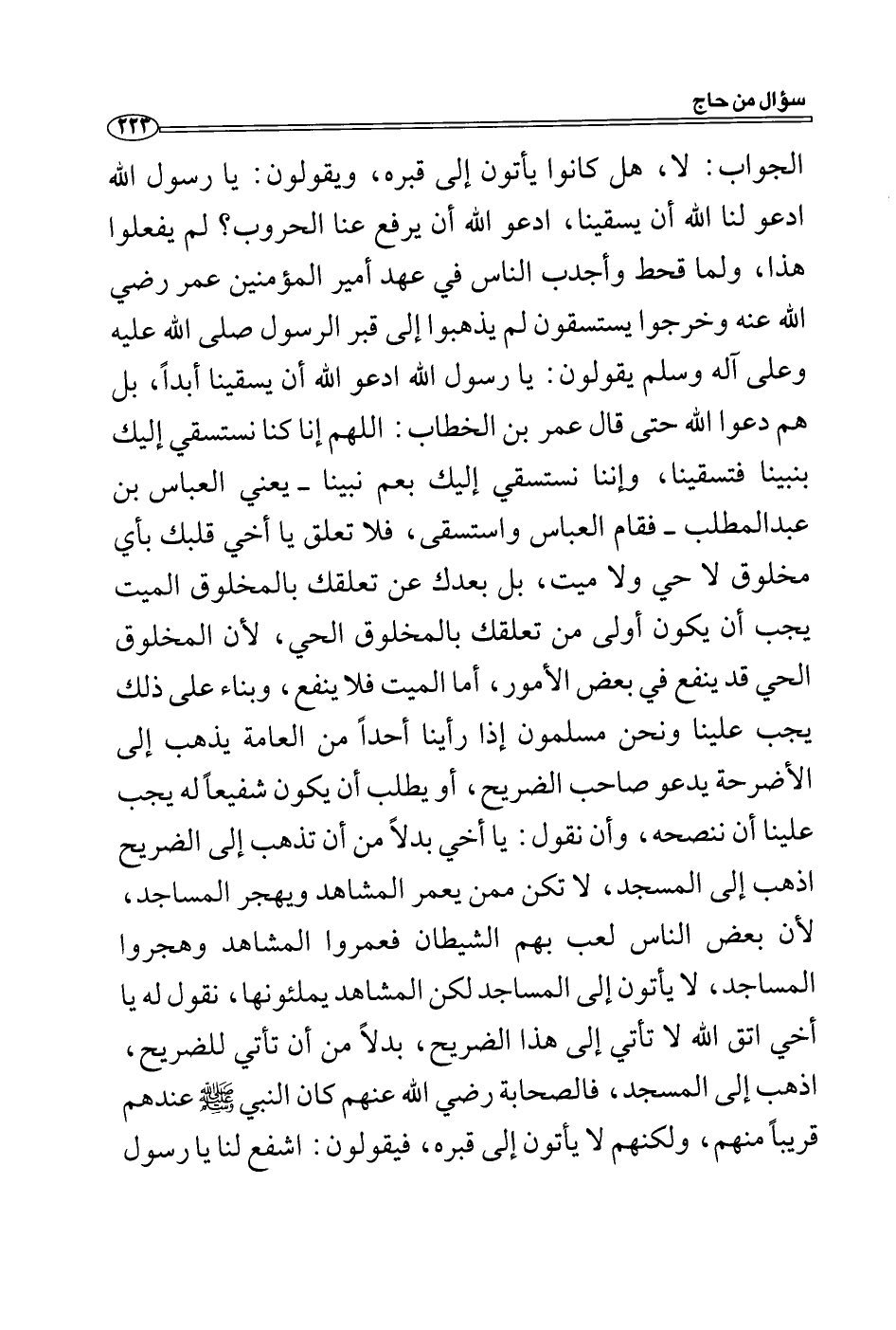 الله عنه وخرجوا يستسقون لم يذهبوا إلى قبر الرسول صلى الله عليه وعلى آله وسلم يقولون: يا رسول الله أدعو الله أن يسقينا أبداً، بل هم دعوا الله حتى قال عمر بن الخطاب: اللهم إنا كنا نستسقي إليك بنبينا فتسقينا، وإننا نستسقي إليك بعم نبينا- يعني العباس بن عبد المطلب- فقام العباس واستسقى، فلا تعلق يا أخي قلبك بأي مخلوق لا حي ولا ميت، بل بعدك عن تعلقك بالمخلوق الميت يجب أن يكون أولى من تعلقك بالمخلوق الحي، لأن المخلوق الحي قد ينفع في بعض الأمور، أما الميت فلا ينفع، وبناء على ذلك يجب علينا ونحن مسلمون إذا رأينا أحداً من العامة يذهب إلى الأضرحة يدعو صاحب الضريح، أو يطلب أن يكون شفيعاً له يجب علينا أن ننصحه، وأن نقول: يا أخي بدلاً من أن تذهب إلى الضريح اذهب إلى المسجد، لا تكن ممن يعمر المشاهد ويهجر المساجد، لأن بعض الناس لعب بهم الشيطان فعمروا المشاهد وهجروا المساجد، لا يأتون إلى المساجد لكن المشاهد يملئونها، نقول له يا أخي اتق الله لا تأتى إلى هذا الضريح، بدلاً من أن تأتي للضريح، اذهب إلى المسجد، فالصحابة رضي الله عنهم كان النبي - صلى الله عليه وسلم - عندهم قريباً منهم، ولكنهم لا يأتون إلى قبره، فيقولون: اشفع لنا يا رسول