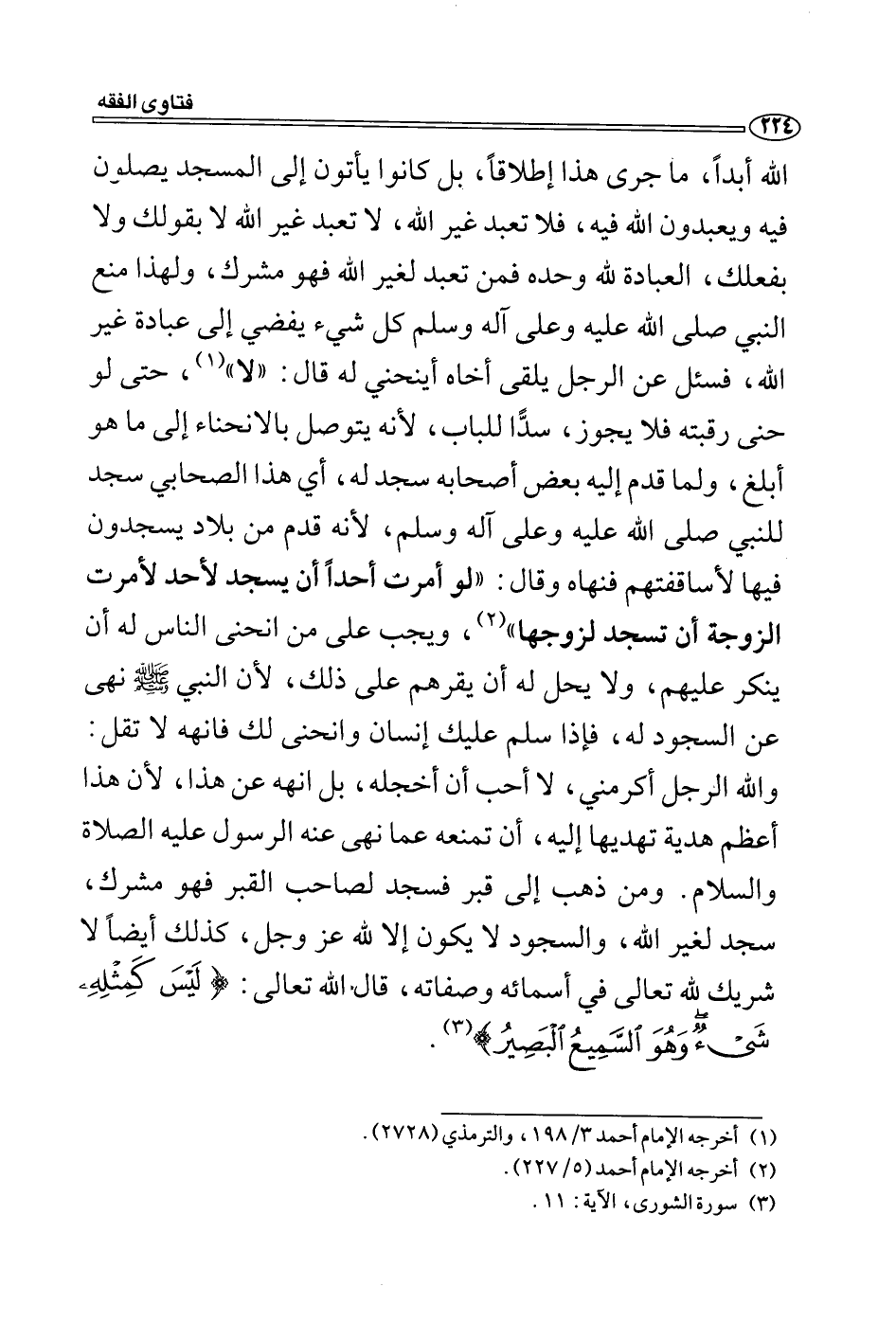 الله أبداً، ما جرى هذا إطلاقاً، بل كانوا يأتون إلى المسجد يصلون فيه ويعبدون الله فيه، فلا تعبد غير الله، لا تعبد غير الله لا بقولك ولا بفعلك، العبادة لله وحده فمن تعبد لغير الله فهو مشرك، ولهذا منع النبي صلى الله عليه وعلى آله وسلم كل شيء يفضي إلى عبادة غير الله، فسئل عن الرجل يلقى أخاه أينحني له قال: "لا" (1) ، حتى لو حنى رقبته فلا يجوز، سدًّا للباب، لأنه يتوصل بالانحناء إلى ما هو أبلغ، ولما قدم إليه بعض أصحابه سجد له، أي هذا الصحابي سجد للنبي صلى الله عليه وعلى آله وسلم، لأنه قدم من بلاد يسجدون فيها لأساقفتهم فنهاه وقال: "لو أمرت أحداً أن يسجد لأحد لأمرت الزوجة أن تسجد لزوجها" (2) ، ويجب على من انحنى الناس له أن ينكر عليهم، ولا يحل له أن يقرهم على ذلك، لأن النبي - صلى الله عليه وسلم - نهى عن السجود له، فإذا سلم عليك إنسان وانحنى لك فانهه لا تقل: والله الرجل أكرمني، لا أحب أن أخجله، بل انهه عن هذا، لأن هذا أعظم هدية تهديها إليه، أن تمنعه عما نهى عنه الرسول عليه الصلاة والسلام. ومن ذهب إلى قبر فسجد لصاحب القبر فهو مشرك، سجد لغير الله، والسجود لا يكون إلا لله عز وجل، كذلك أيضاً لا شريك لّه تعالى في أسمائه وصفاته، قال " الله تعالى: (لَيْسَ كَمِثْلِهِ شَيْءٌ وَهُوَ السَّمِيعُ الْبَصِيرُ) (3) .