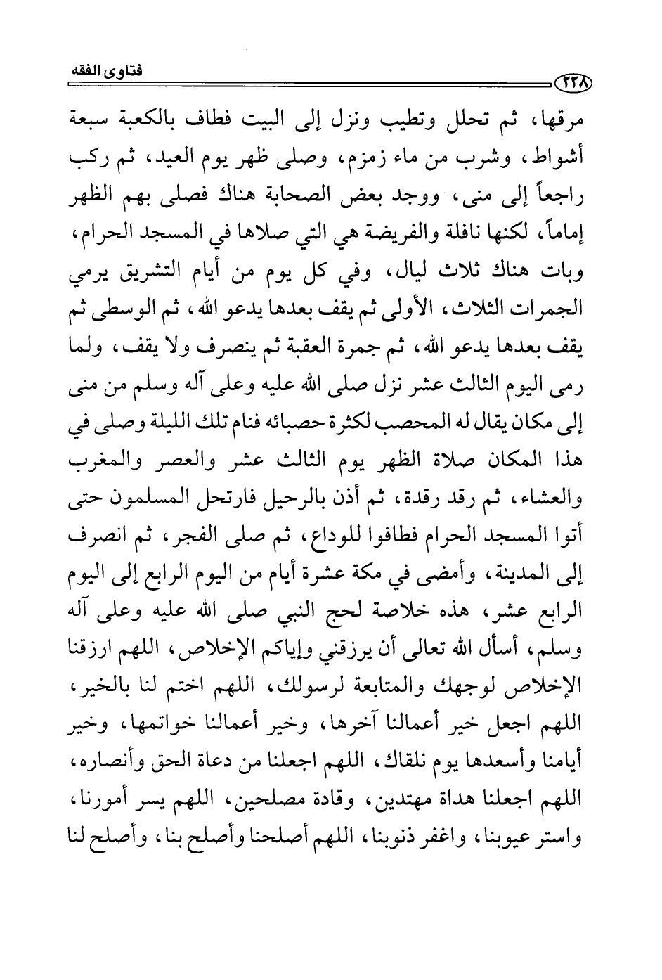 إماماً، لكنها نافلة والفريضة هي التي صلاها في المسجد الحرام، وبات هناك ثلاث ليال، وفي كل يوم من أيام التشريق يرمي الجمرات الثلاث، الأولى ثم يقف بعدها يدعو الله، ثم الوسطى ثم يقف بعدها يدعو الله، ثم جمرة العقبة ثم ينصرف ولا يقف، ولما رمى اليوم الثالث عشر نزل صلى الله عليه وعلى آله وسلم من منى إلى مكان يقال له المحصب لكثرة حصبائه فنام تلك الليلة وصلى في هذا المكان صلاة الظهر يوم الثالث عشر والعصر والمغرب والعشاء، ثم رقد رقدة، ثم أذن بالرحيل فارتحل المسلمون حتى أتوا المسجد الحرام فطافوا للوداع، ثم صلى الفجر، ثم انصرف إلى المدينة، وأمضى في مكة عشرة أيام من اليوم الرابع إلى اليوم الرابع عشر، هذه خلاصة لحج النبي صلى الله عليه وعلى آله وسلم، أسأل الله تعالى أن يرزقني وإياكم الإخلاص، اللهم ارزقنا الإخلاص لوجهك والمتابعة لرسولك، اللهم اختم لنا بالخير، اللهم اجعل خير أعمالنا آخرها، وخير أعمالنا خواتمها، وخير أيامنا وأسعدها يوم نلقاك، اللهم اجعلنا من دعاة الحق وأنصاره، اللهم اجعلنا هداة مهتدين، وقادة مصلحين، اللهم يسر أمورنا، واستر عيوبنا، واغفر ذنوبنا، اللهم أصلحنا وأصلح بنا، وأصلح لنا