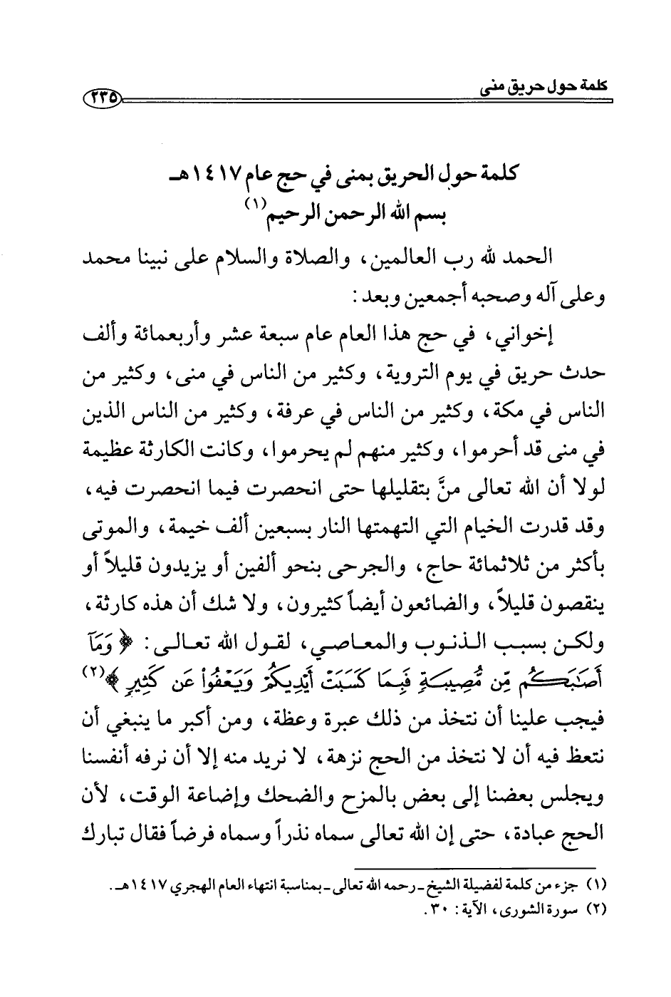 كلمة حولي الحريق بمنى في حج عام 1417 هـ