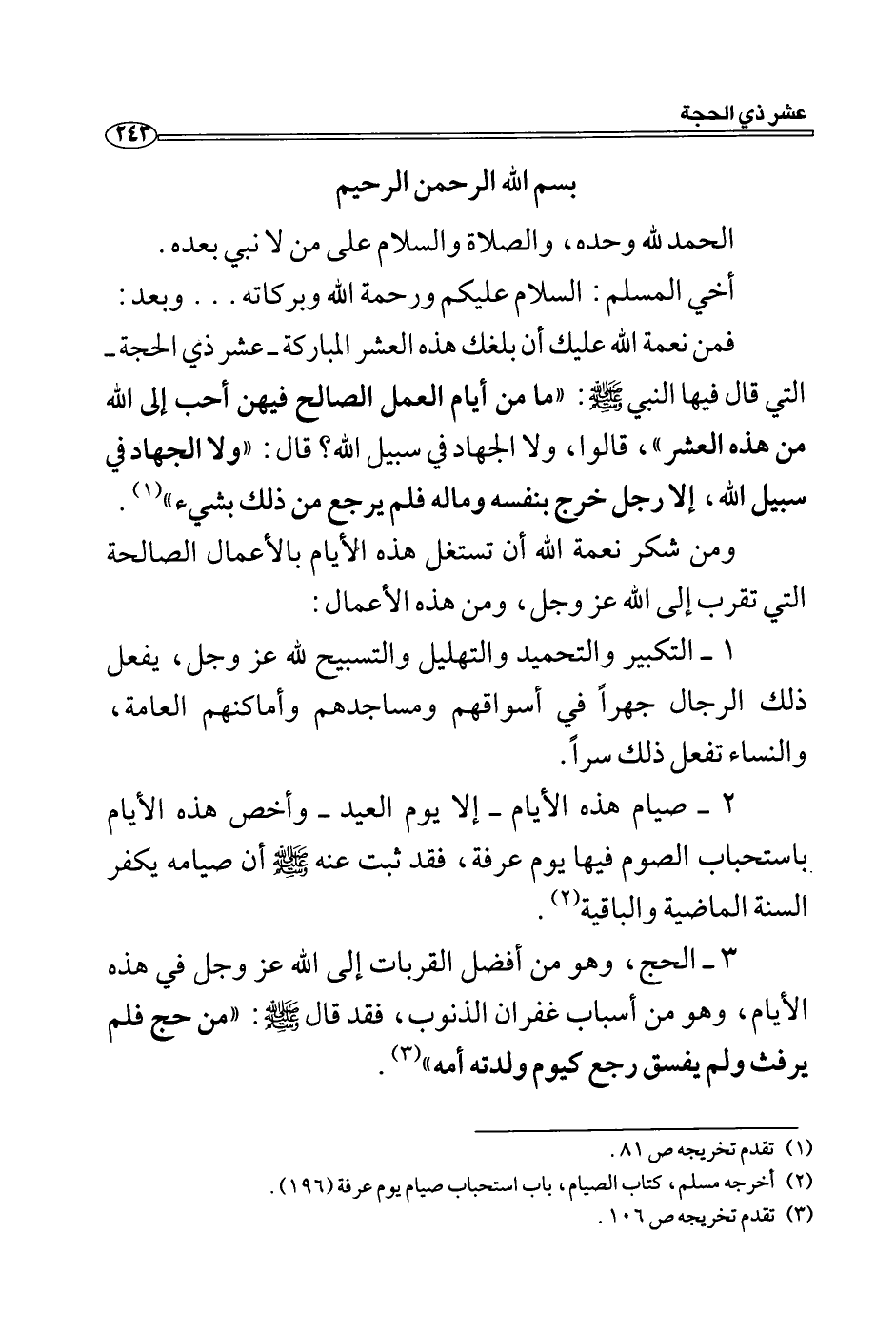 فمن نعمة الله عليك أن بلغك هذه العشر المباركة- عشر ذي الحجة- التي قال فيها النبي - صلى الله عليه وسلم -: "ما من أيام العمل الصالح فيهن أحب إلى الله من هذه العشر "، قالوا، ولا الجهاد في سبيل الله؟ قال: "ولا الجهاد في سبيل الله، إلا رجل خرج بنفسه وماله فلم يرجع من ذلك بشيء" (1) .