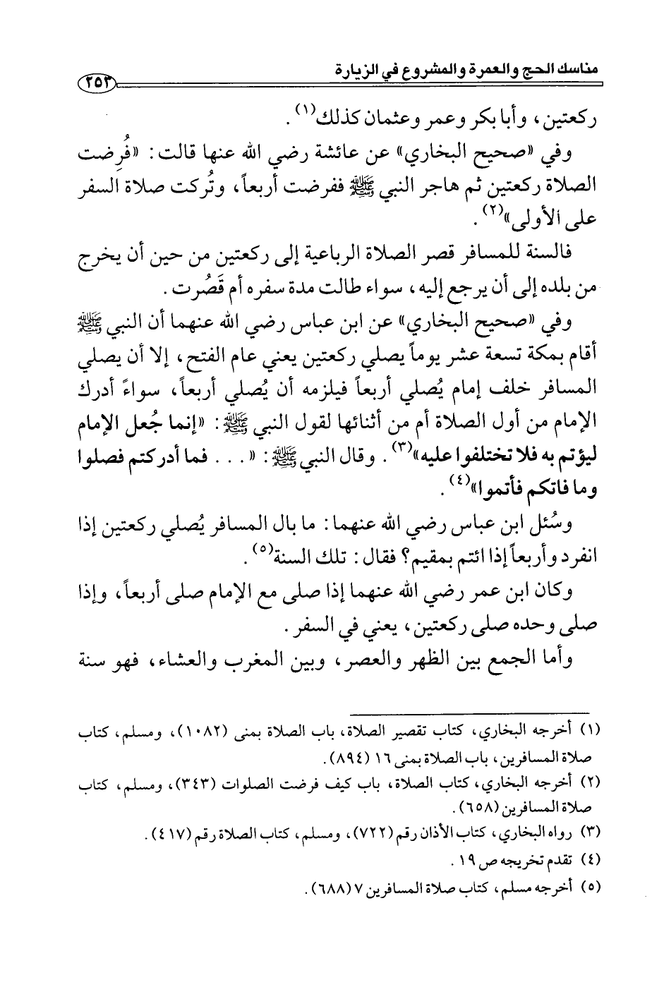 وفي "صحيح البخاري " عن عائشة رضي الله عنها قالت: "فُرِضت الصلاة ركعتين ثم هاجر النبي - صلى الله عليه وسلم - ففرضت أربعاً، وتُركت صلاة السفر على الأولى" (2) .
