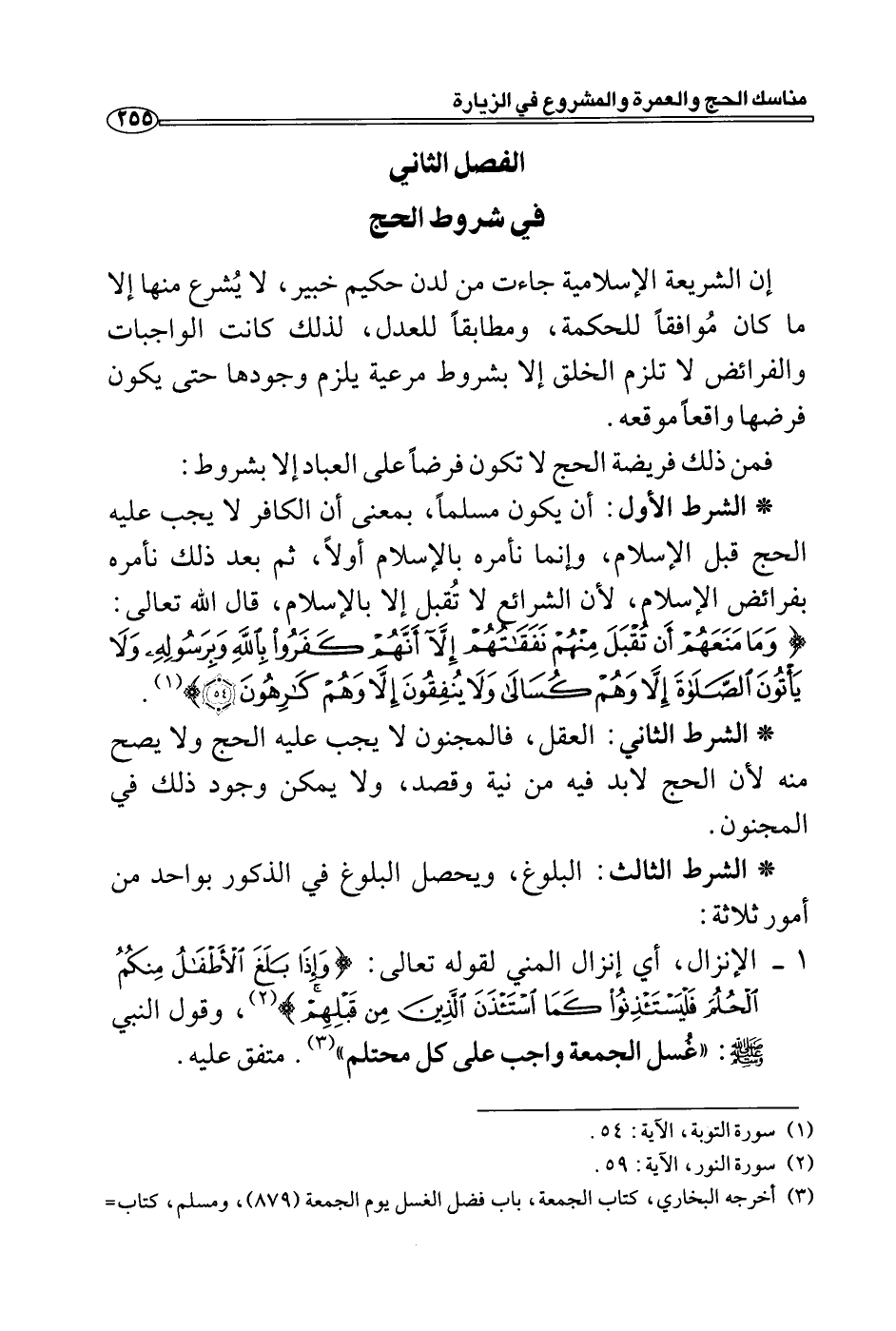 إن الشريعة الإسلامية جاءت من لدن حكيم خبير، لا يُشرع منها إلا ما كان مُوافقاً للحكم، ومطابقاً للعدل، لذلك كانت الواجبات والفرائض لا تلزم الخلق إلا بشروط مرعية يلزم وجودها حتى يكون فرضها واقعاً موقعه.