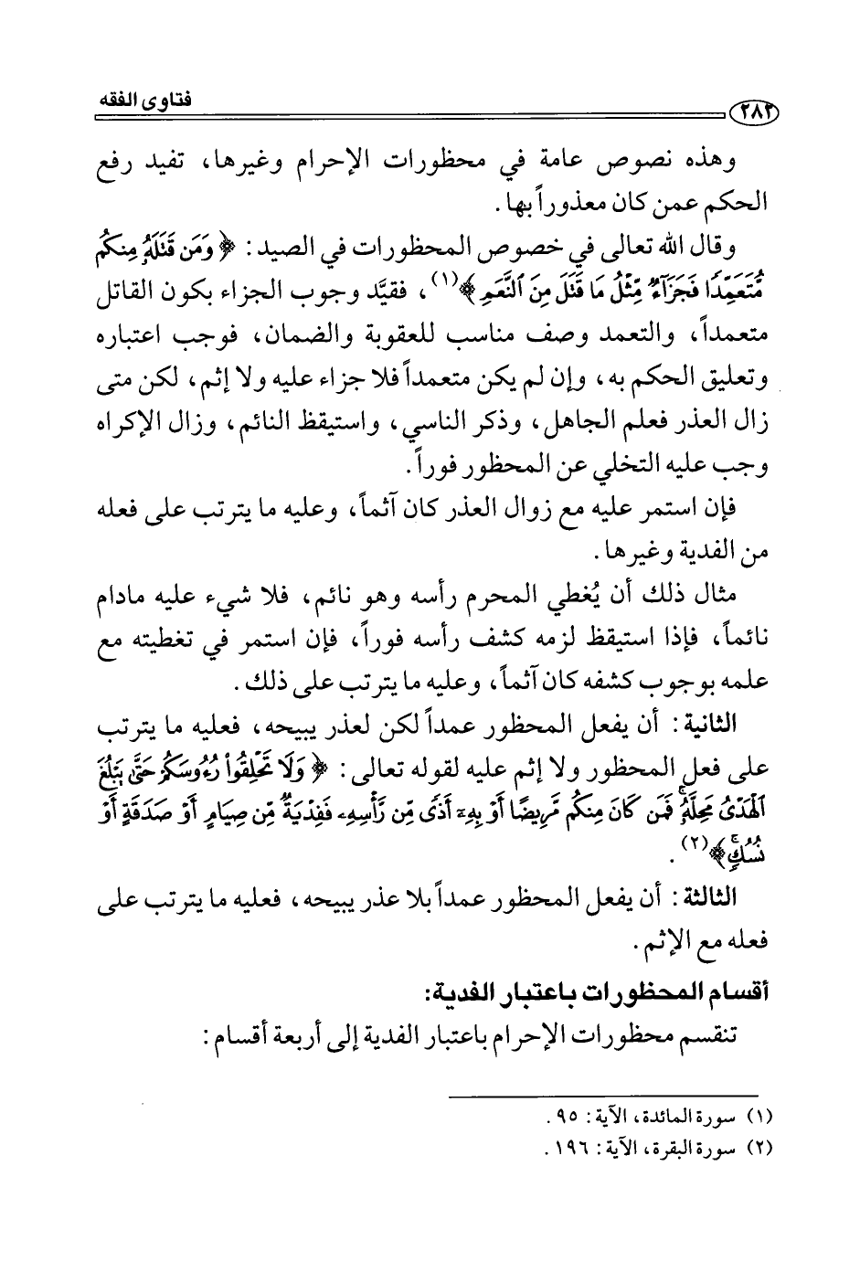 وقال الله تعالى في خصوص المحظورات في الصيد: (وَمَنْ قَتَلَهُ مِنْكُمْ مُتَعَمِّدًا فَجَزَاءٌ مِثْلُ مَا قَتَلَ مِنَ النَّعَمِ) (1) ، فقيَّد وجوب الجزاء بكون القاتل متعمداً، والتعمد وصف مناسب للعقوبة والضمان، فوجب اعتباره وتعليق الحكم به، وإن لم يكن متعمداً فلا جزاء عليه ولا إثم، لكن متى زال العذر فعلم الجاهل، وذكر الناسي، واستيقظ النائم، وزال الإكراه وجا عليه التخلي عن المحظور فوراً.