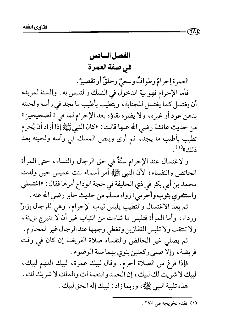 فإذا فرغ من الصلاة أحرم، وقال لبيك عمرة، لبيك اللهم لبيك، لبيك لا شريك لك لبيك، إن الحمد والنعمة لك والملك لا شريك لك.