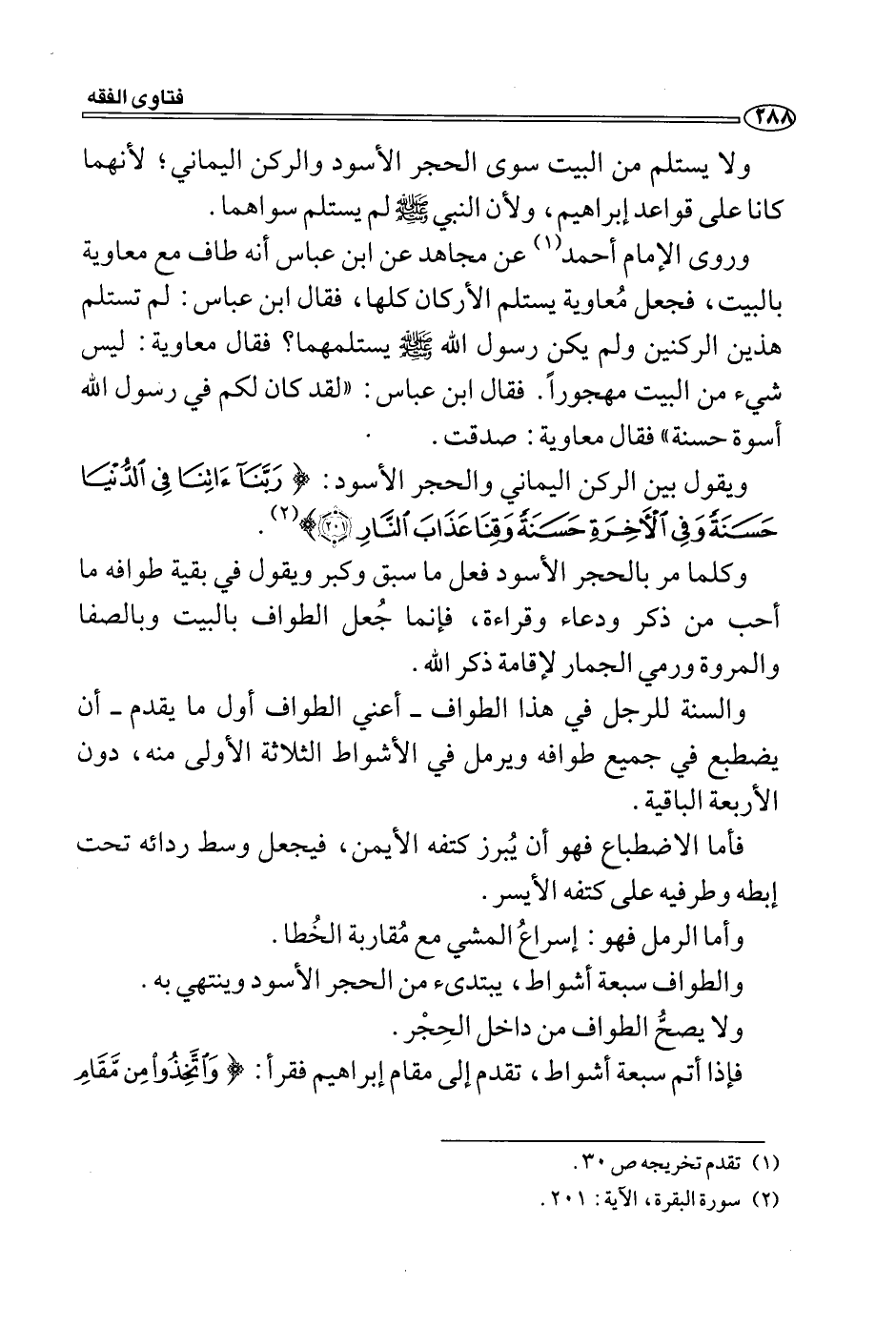 وروى الإمام أحمد (1) عن مجاهد عن ابن عباس أنه طاف مع معاوية بالبيت، فجعل مُعاوية يستلم الأركان كلها، فقال ابن عباس: لم تستلم هذين الركنين ولم يكن رسول الله - صلى الله عليه وسلم - يستلمهما؟ فقال معاوية: ليس شيء من البيت مهجوراً. فقال ابن عباس: "لقد كان لكم في رسول الله أسوة حسنة" فقال معاوية: صدقت.