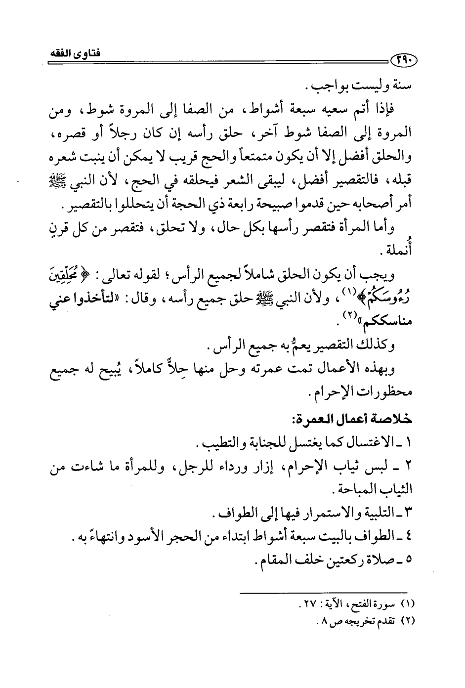 فإذا أتم سعيه سبعة أشواط، من الصفا إلى المروة شوط، ومن المروة إلى الصفا شوط آخر، حلق رأسه إن كان رجلاً أو قصره، والحلق أفضل إلا أن يكون متمتعاً والحج قريب لا يمكن أن ينبت شعره قبله، فالتقصير أفضل، ليبقى الشعر فيحلقه في الحج، لأن النبي - صلى الله عليه وسلم - أمر أصحابه حين قدموا صبيحة رابعة ذي الحجة أن يتحللوا بالتقصير.