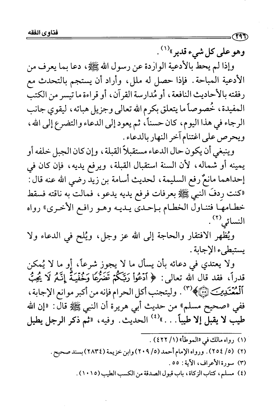ولا يعتدي في دعائه بأن يسأل ما لا يجوز شرعاً، أو ما لا يُمكن قدراً، فقد قال الله تعالى: (ادْعُوا رَبَّكُمْ تَضَرُّعًا وَخُفْيَةً إِنَّهُ لَا يُحِبُّ الْمُعْتَدِينَ (55)) (3) . وليتجنب أكل الحرام فإنه من أكبر موانع الإجابة، ففي "صحيح مسلم " من حديث أبي هريرة أن النبي - صلى الله عليه وسلم - قال: "إن الله طيب لا يقبل إلا طيباً ... " (4) الحديث. وفيه، "ثم ذكر الرجل يطيل
