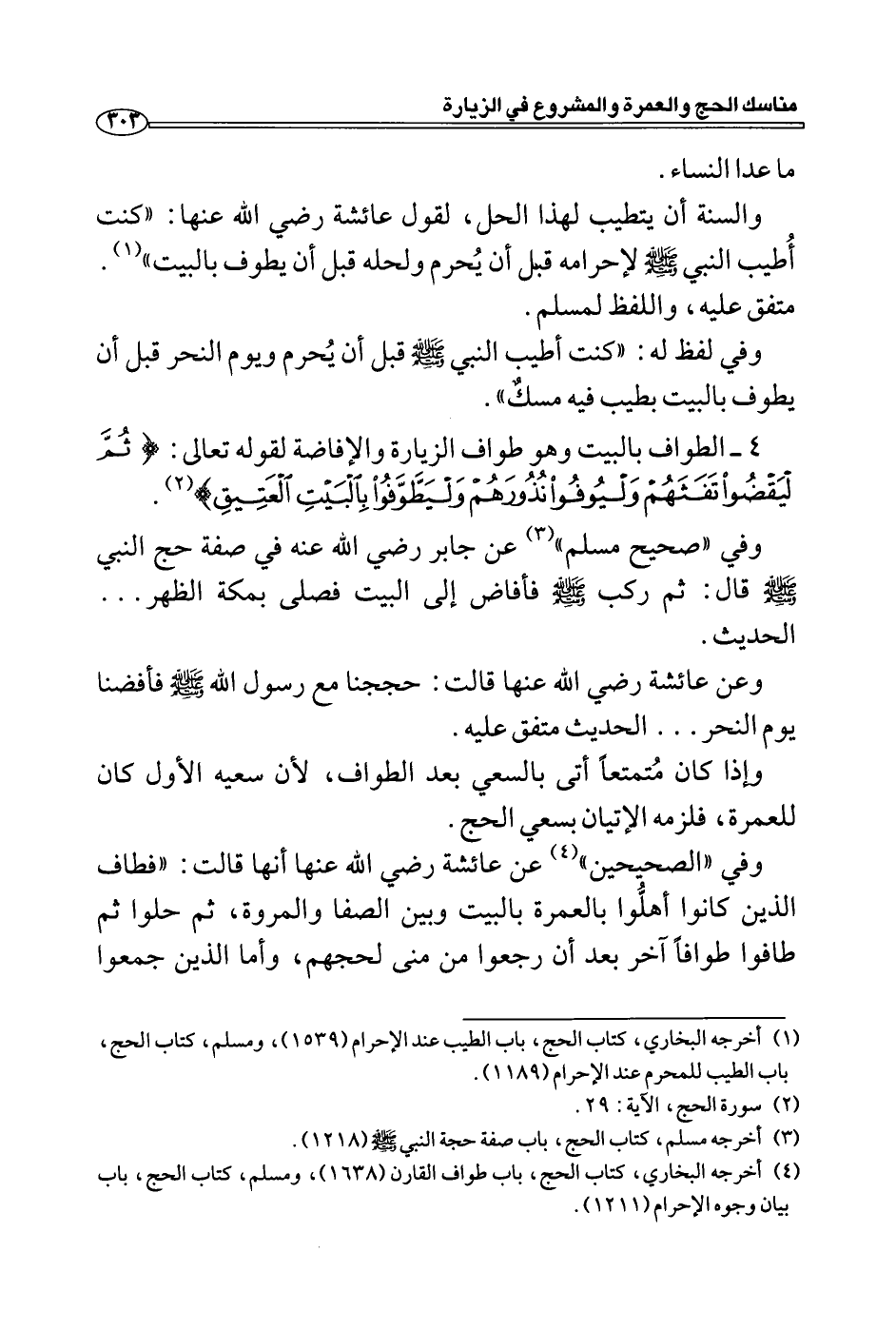 وفي لفظ له: "كنت أطيب النبي - صلى الله عليه وسلم - قبل أن يُحرم ويوم النحر قبل أن يطوف بالبيت بطيب فيه مسكٌ ".