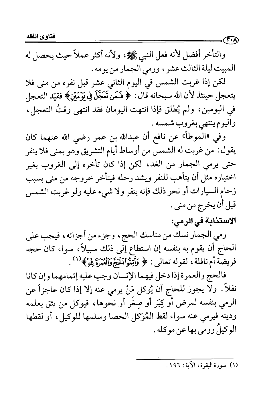 الاستنابة في الرمي: رمي الجمار نسك من مناسك الحج، وجزء من أجزائه، فيجب على الحاج أن يقوم به بنفسه إن استطاع إلى ذلك سبيلاً، سواء كان حجه فريضة أم نافلة، لقوله تعالى: (وَأَتِمُّوا الْحَجَّ وَالْعُمْرَةَ لِلَّهِ) (1) .