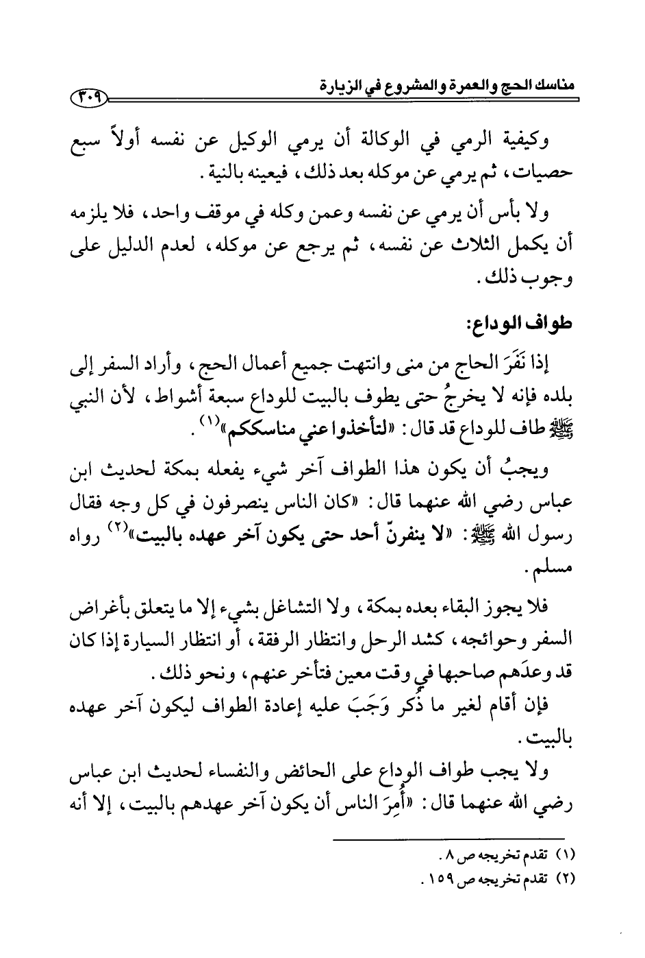 ولا يجب طواف الوداع على الحائض والنفساء لحديث ابن عباس رضي الله عنهما قال: "أُمِرَ الناس أن يكون آخر عهدهم بالبيت، إلا أنه