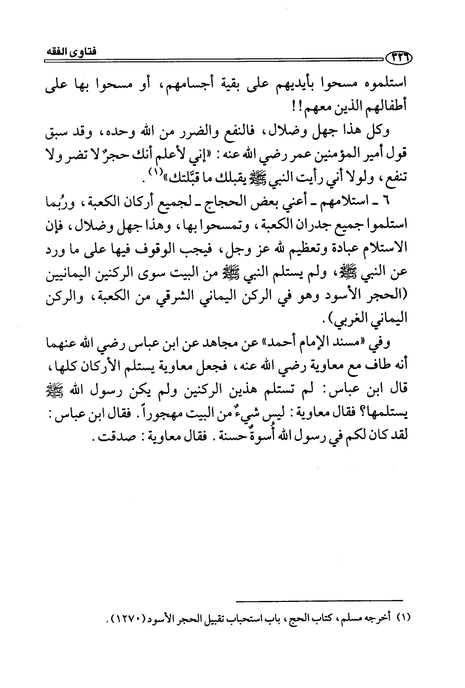وفي "مسند الإمام أحمد" عن مجاهد عن ابن عباس رضي الله عنهما أنه طاف مع معاوية رضي الله عنه، فجعل معاوية يستلم الأركان كلها، قال ابن عباس: لم تستلم هذين الركنين ولم يكن رسول الله - صلى الله عليه وسلم - يستلمها؟ فقال معاوية: ليس شيءٌ من البيت مهجوراً. فقال ابن عباس: