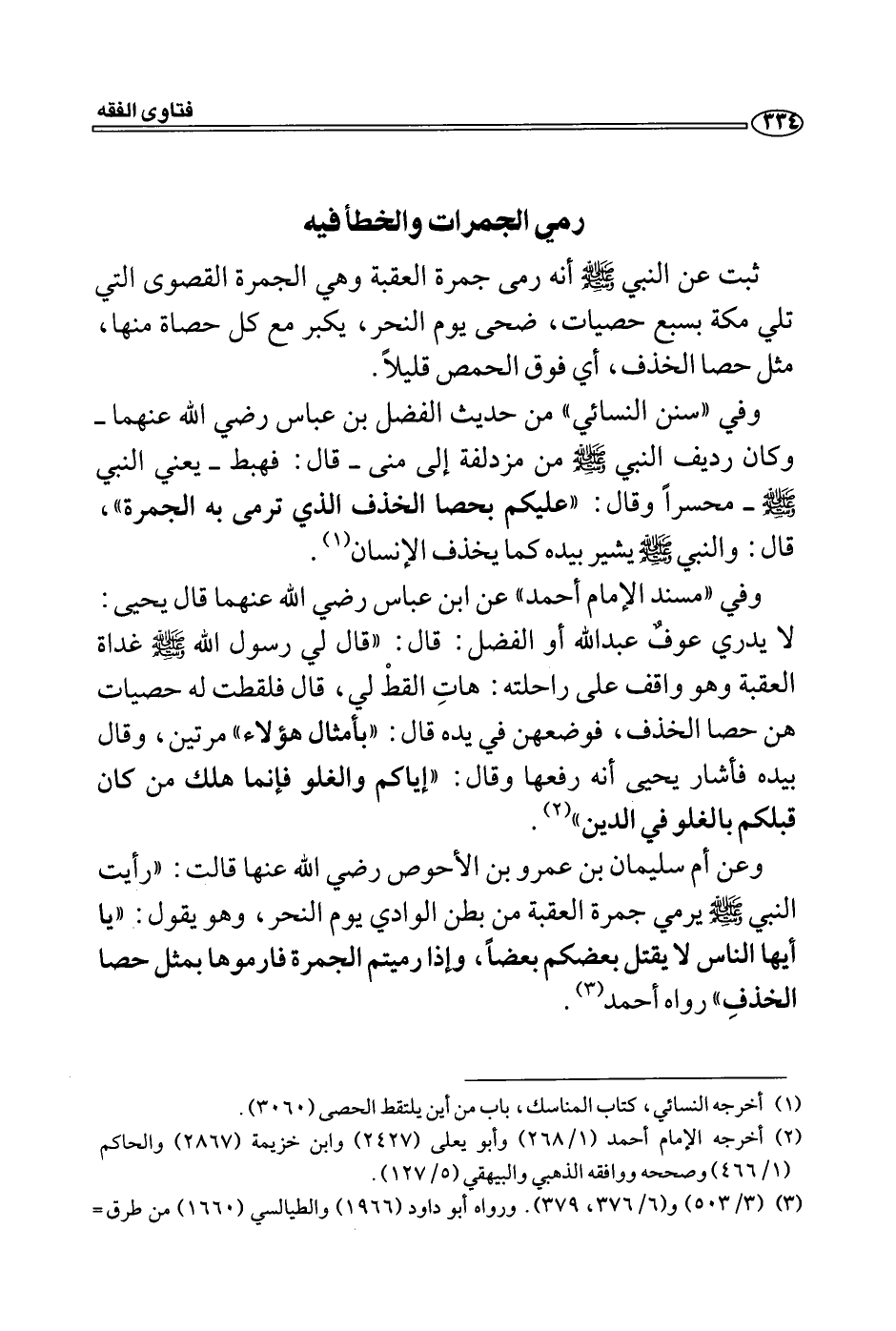 وفي "مسند الإمام أحمد" عن ابن عباس رضي الله عنهما قال يحيى: لا يدري عوفٌ عبد الله أو الفضل: قال: "قال لي رسول الله - صلى الله عليه وسلم - غداة العقبة وهو واقف على راحلته: هاتِ القطْ لي، قال فلقطت له حصيات هن حصا الخذف، فوضعهن في يده قال: "بأمثال هؤلاء" مرتين، وقال بيده فأشار يحيى أنه رفعها وقال: "إياكم والغلو فإنما هلك من كان قبلكم بالغلو في الدين " (2) .