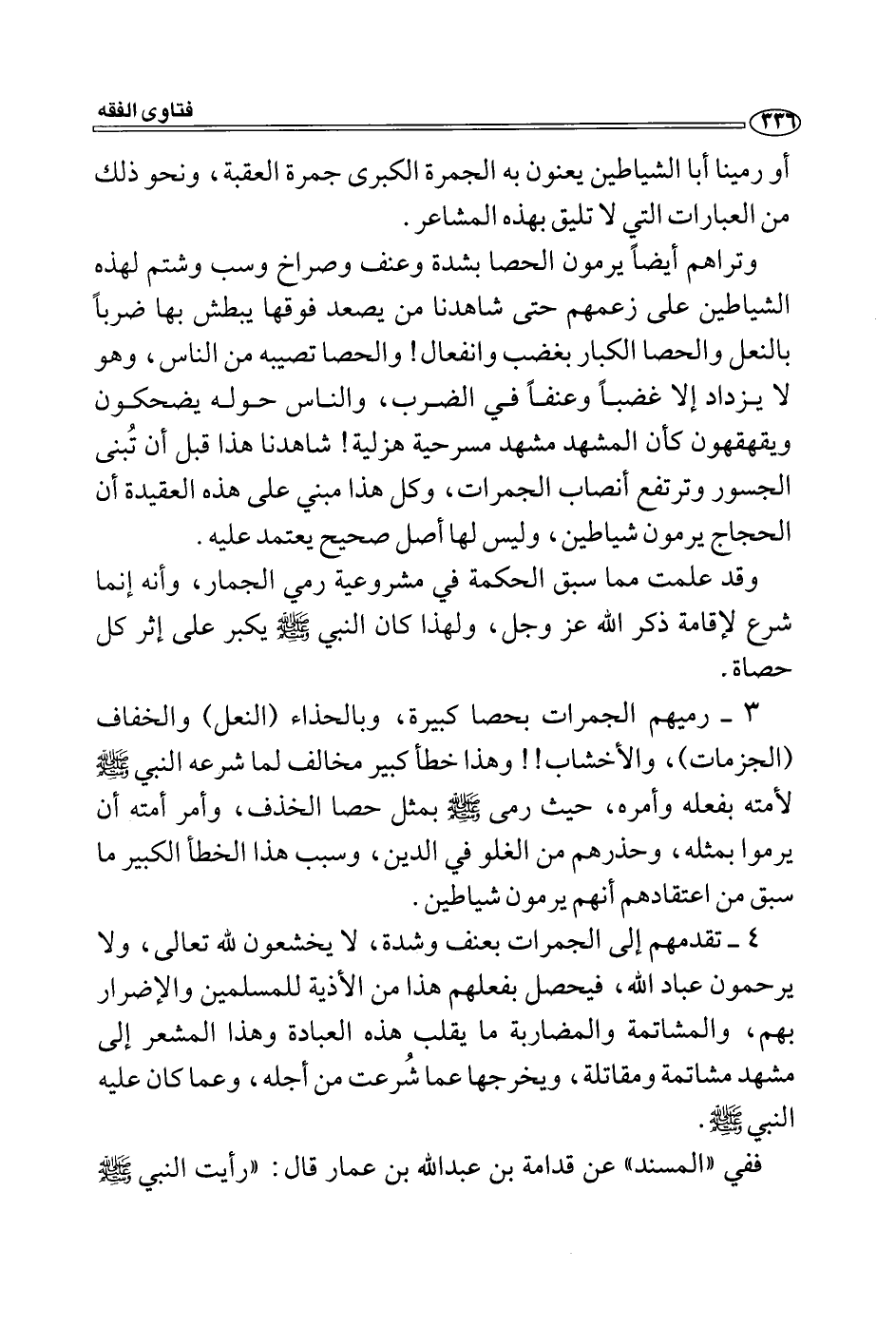 3- رميهم الجمرات بحصا كبيرة، وبالحذاء (النعل) والخفاف (الجزمات) ، والأخشاب!! وهذا خطأ كبير مخالف لما شرعه النبي - صلى الله عليه وسلم - لأمته بفعله وأمره، حيث رمى - صلى الله عليه وسلم - بمثل حصا الخذف، وأمر أمته أن يرموا بمثله، وحذرهم من الغلو في الدين، وسبب هذا الخطأ الكبير ما سبق من اعتقادهم أنهم يرمون شياطين.