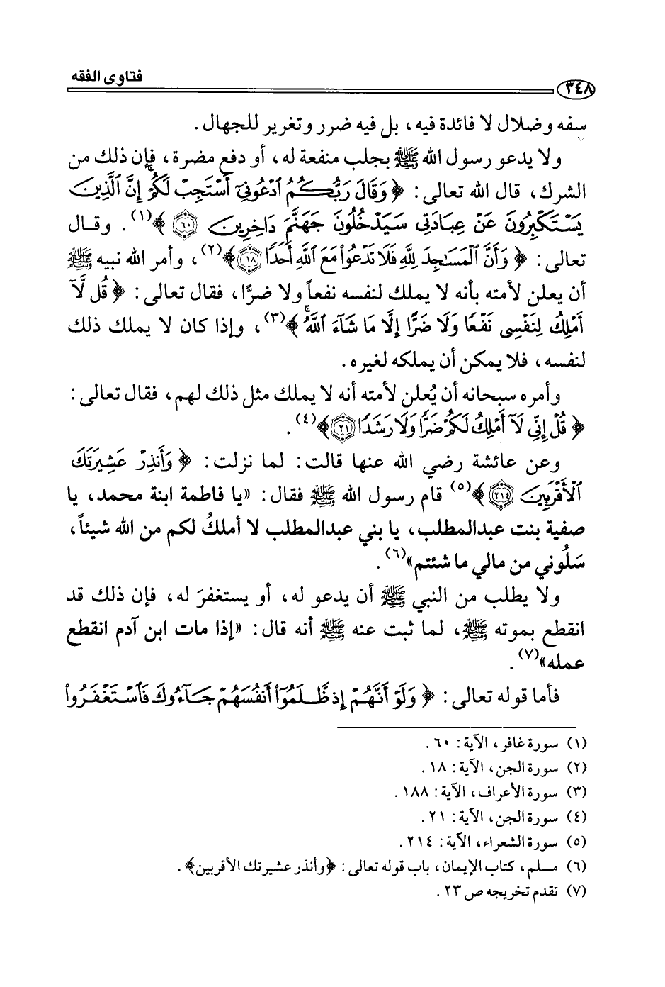 ولا يدعو رسول الله - صلى الله عليه وسلم - بجلب منفعة له، أو دفع مضرة، فان ذلك من الشرك، قال الله تعالى: (وَقَالَ رَبُّكُمُ ادْعُونِي أَسْتَجِبْ لَكُمْ إِنَّ الَّذِينَ يَسْتَكْبِرُونَ عَنْ عِبَادَتِي َيَدْخُلُونَ جَهَنَّمَ دَاخِرِينَ (60)) (1) . وقال تعالى: (وَأَنَّ الْمَسَاجِدَ لِلَّهِ فَلَا تَدْعُوا مَعَ اللَّهِ أَحَدًا (18)) (2) ، وأمر الله نبيه - صلى الله عليه وسلم - أن يعلن لأمته بأنه لا يملك لنفسه نفعاً ولا ضرًّا، فقال تعالى: (قُلْ لَا أَمْلِكُ لِنَفْسِي نَفْعًا وَلَا ضَرًّا إِلَّا مَا شَاءَ اللَّهُ) (3) ، وإذا كان لا يملك ذلك لنفسه، فلا يمكن أن يملكه لغيره.